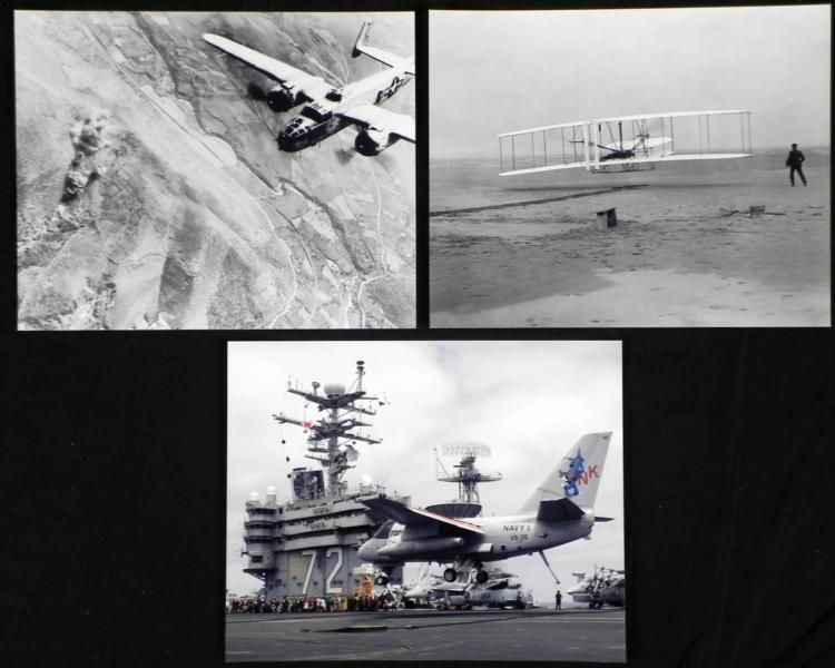 Here are three photos of famous aviation scenes. * * These are 8 x 10 black & white glossy high quality archive reprints. All are in excellent condition. * * * They feature: * * The Wright brothers at Kitty Hawk B-25 plane bombing Rome George W Bush landing on the deck of the USS Abraham Lincoln