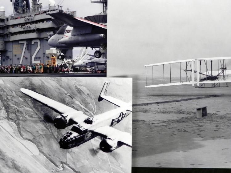 3 Photos Wright Brothers, WWII Bombing, Bush Aircraft