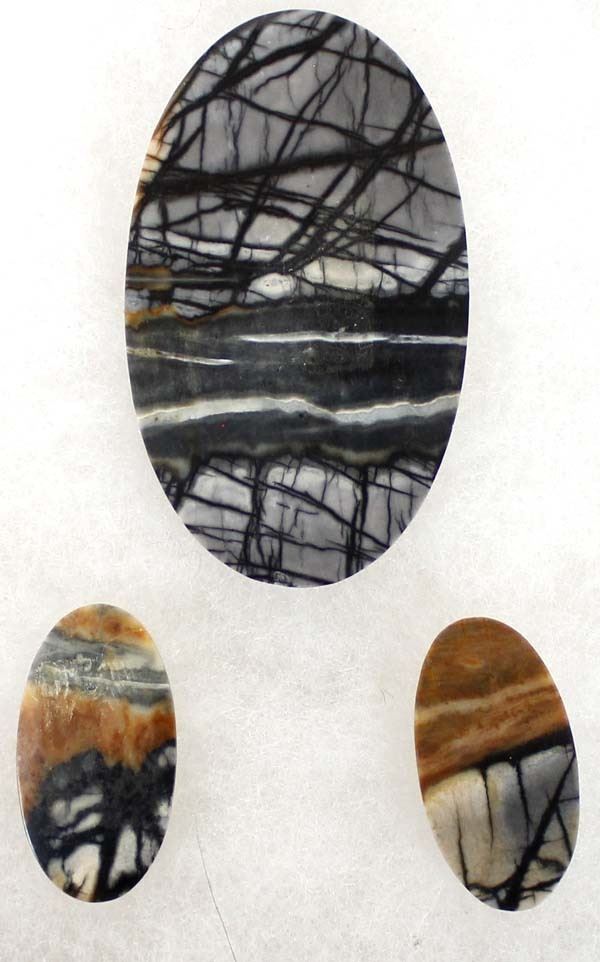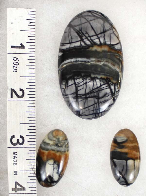 3 Picasso Marble Stone Cabochons, includes 2 measuring 1 3/8'' x .75''W and weighing 9.51 grams total wt., 1 measuring 2.5'' x 1.5''W and weighing 23.87 grams