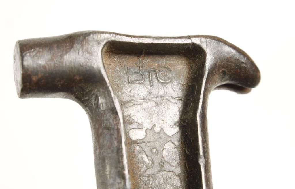 (1) Picket Pin with case. Circa 1912. Pin is metal construction stamped "BTC". In aged condition. Approx 13-1/2" long. With brown leather carry case in aged condition, approx 131/2" long. 1) 1912 Picket pin with case. Pin has wear, pitting, scratches, and discoloration. Leather scabbard is intact with wear, shrinkage, cracking of leather, some corrosion of metal, and discoloration. Measuring 14-1/4" overall including the scabbard; Iron picket pin measures 13-3/4" long. (1) (1) Picket pin with case. Circa 1912. Metal picket pin with leather carry case. Pin has wear, pitting, scratches, and discoloration. Leather scabbard is intact with wear, shrinkage, cracking of leather, some corrosion of metal, and discoloration. Measuring 14-1/4" overall including the scabbard; Iron picket pin measures 13-3/4" long.The 1912 picket pin was originally issued with the Model 1912 Cavalry Equipment and continued in use through the end of the US Horse Cavalry. Designed to provide the trooper with a multi-purpose tool, the M1912 Picket Pin served as a hammer, picket pin, and handle for the entrenching tool, pick and axe.