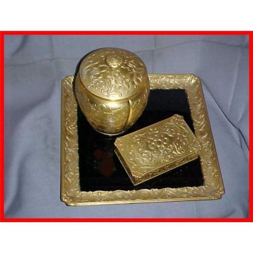 This matching three piece smoking set consists of a tray, a humidor and a cigarette box. Size of the tray is 13-1/4" by 13-1/4" by 1-1/8" deep. Size of the humidor is 7-1/2" tall and 5-3/4" in diameter. The cigarette box is 1-1/4" tall, 6-3/4" long and 4-1/8" wide. There are no markings on this heavy quality smoking set. The surface has a burnished gold gilt surface. The tray has a reversed black painted glass with a matching metal frame. Unknown age; but in an Art Nouveau pattern. The cigarette box has two molded built-in hinges on the lid and bottom. The box is lined with a cedar wood. The humidor lid has a device inside the lid to hold a damp sponge to hold in moisture in the jar. Good condition with some scuffing on burnished gold surface(Mainly on bottom edge of tray) and slight scratching on glass surface. I bought this high quality set over ten years ago from a Midwestern antique shop.