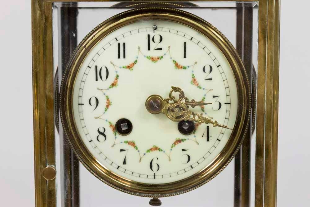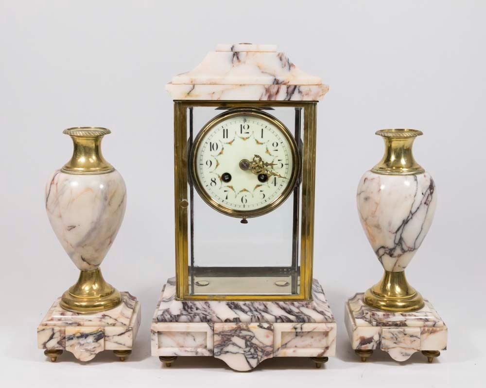 French. Enamel face. Pair matching urns. Clock approx. 14" H. Urns approx. 10" H. Pendulum cannot be attached.