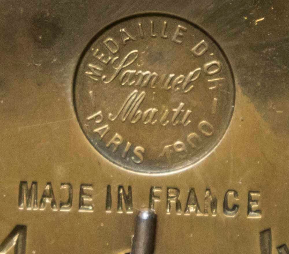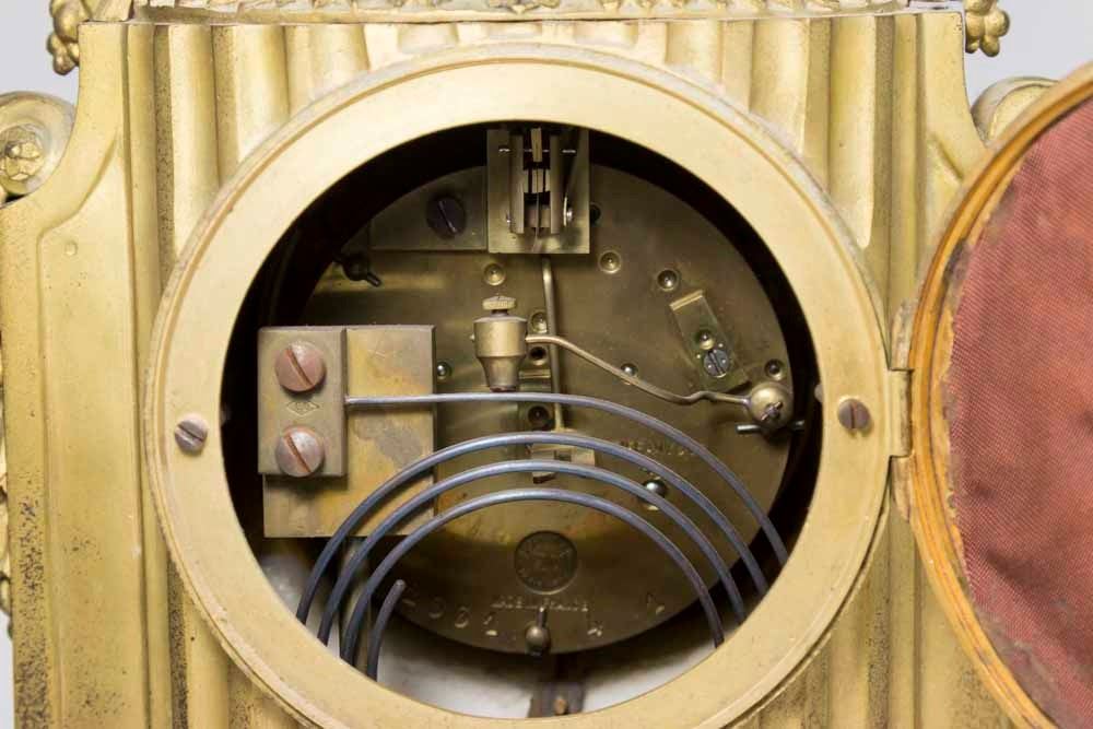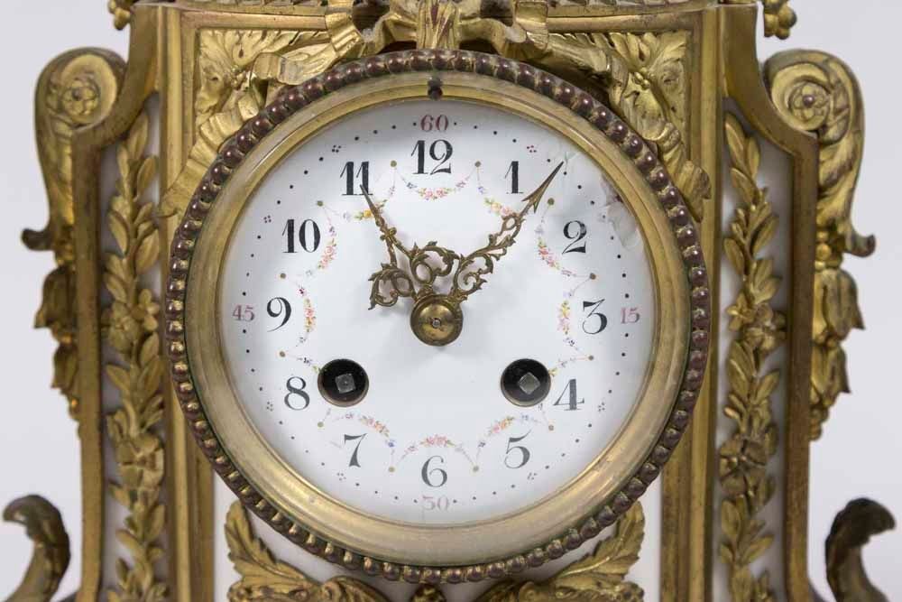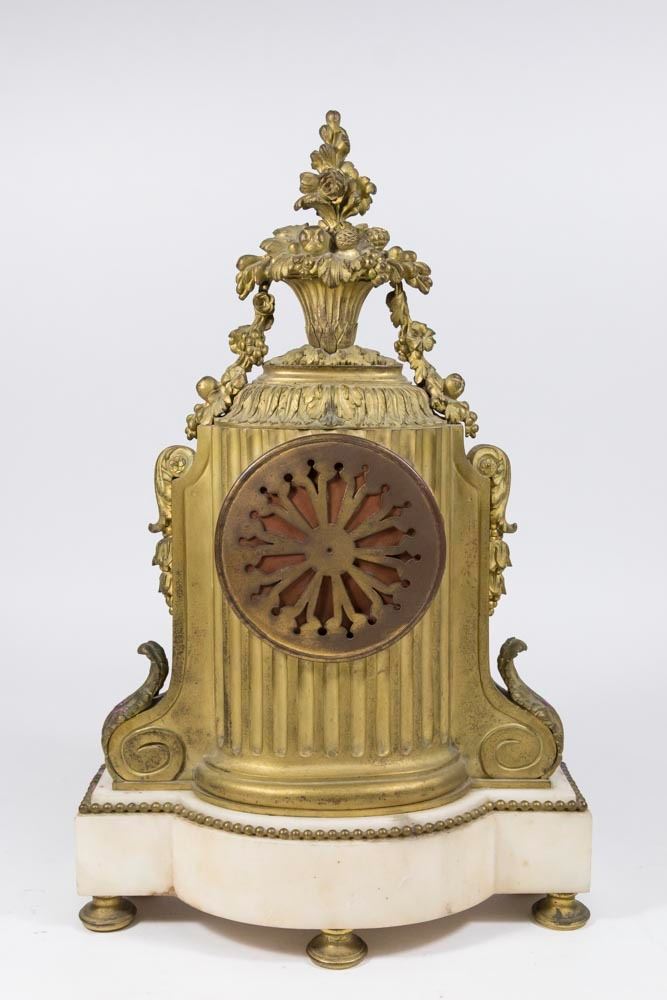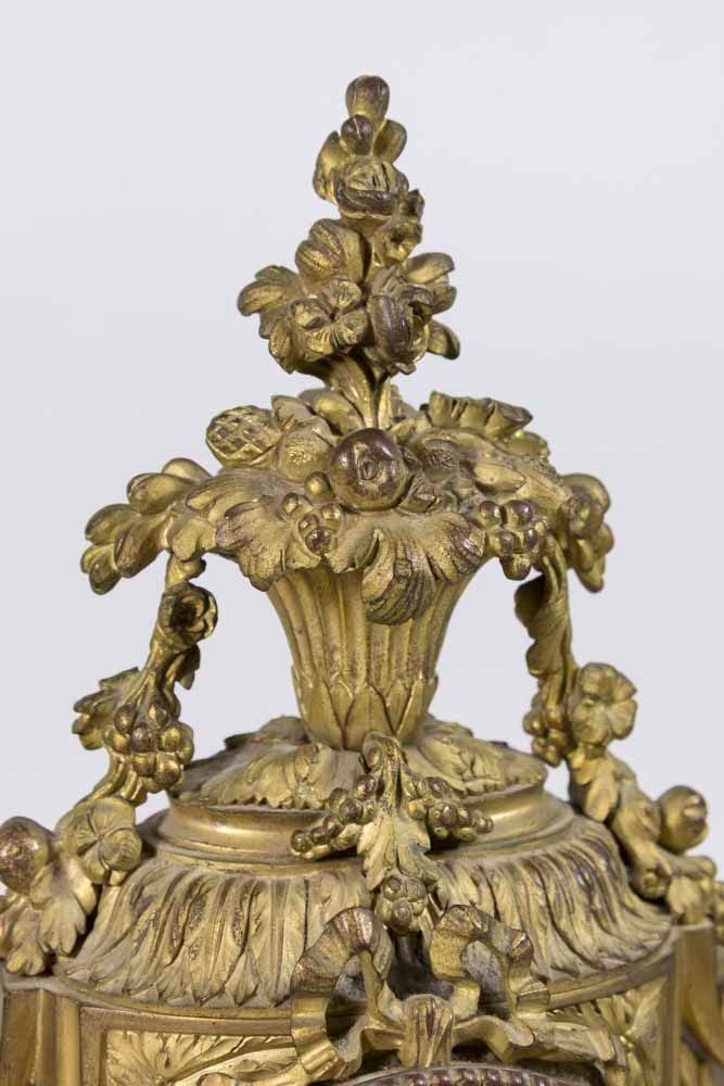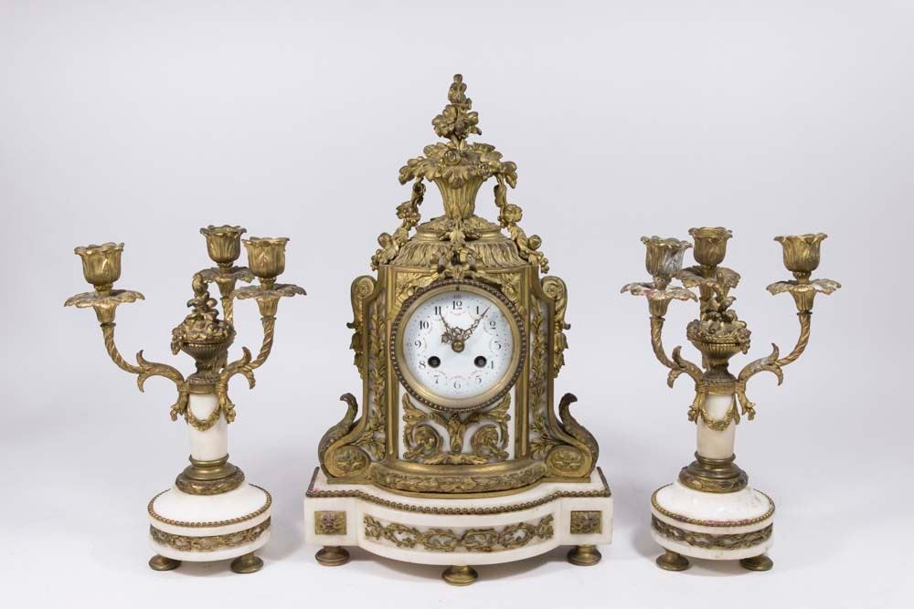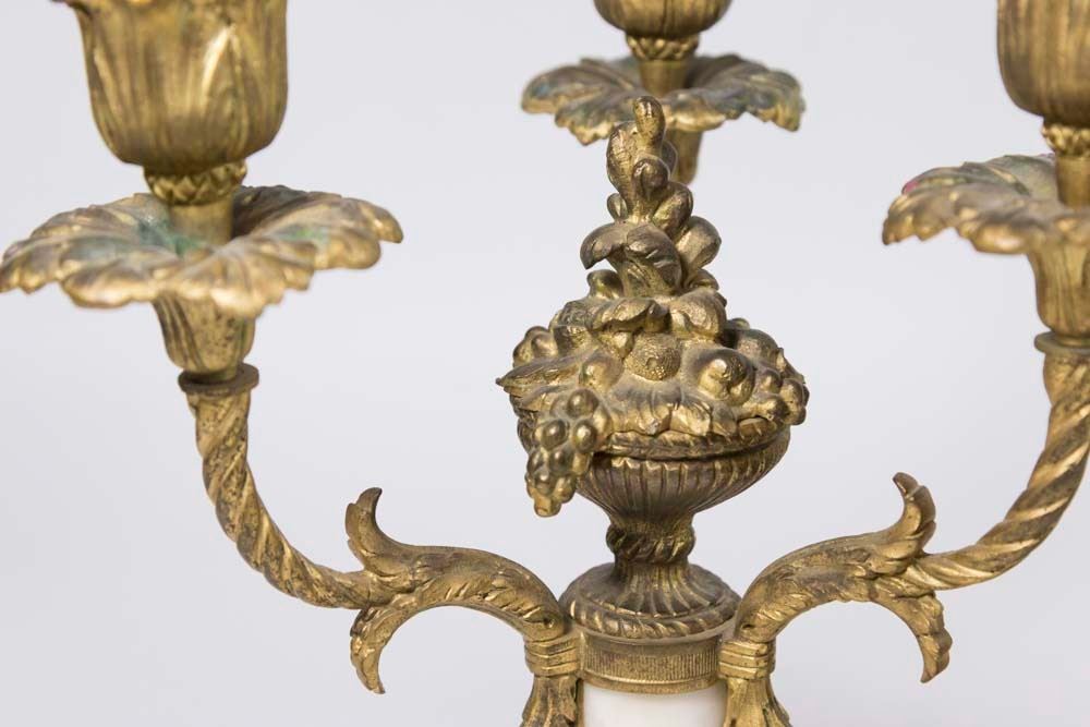 Retailed by Tiffany. Stamped Marti-medaille d'or-1900 Clock approx. 16 1/2" H. Candelabra approx. 11" H.