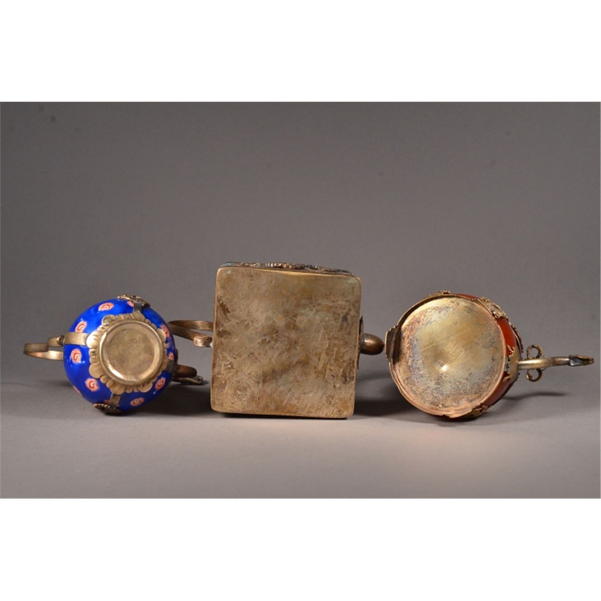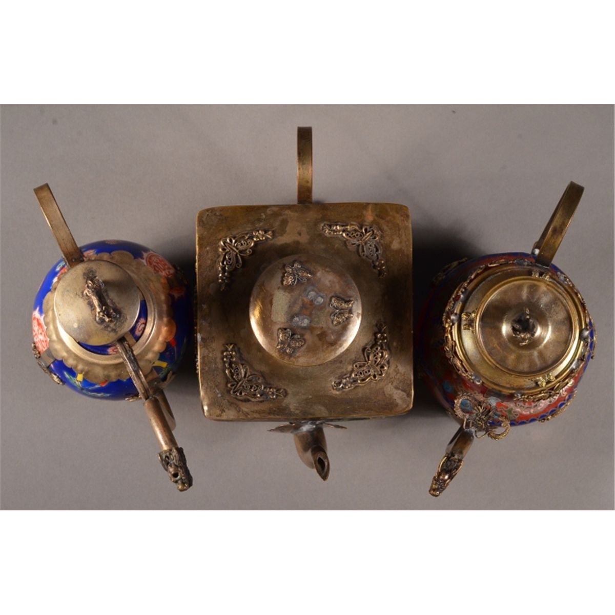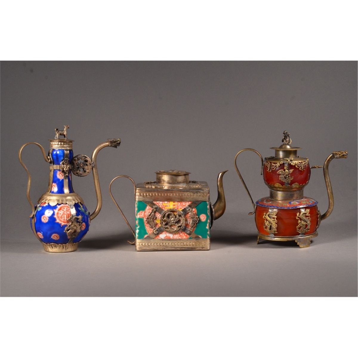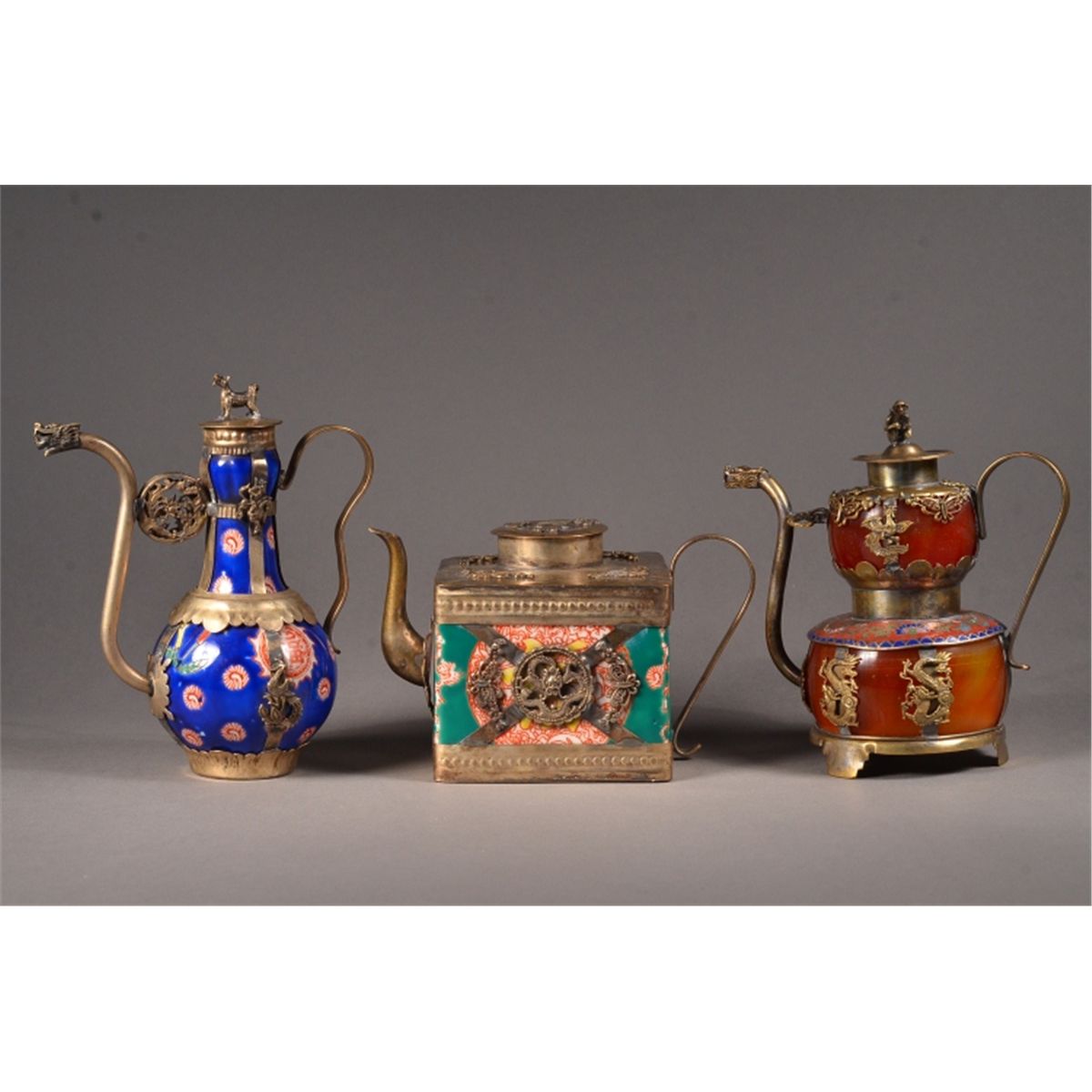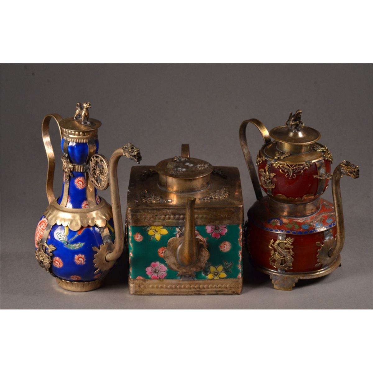 Set of three Chinese porcelain tea pots; H: 15 cm X W: 13 cm (approx.)