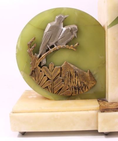 Circa 1930s. Signed Ortoheid, Bordeaux. Onyx and silvered and gilt metal bird decor. Clock approx. 12" H x 16 1/2" W. Garnitures approx. 8 1/2" H x 7" W. (5291)