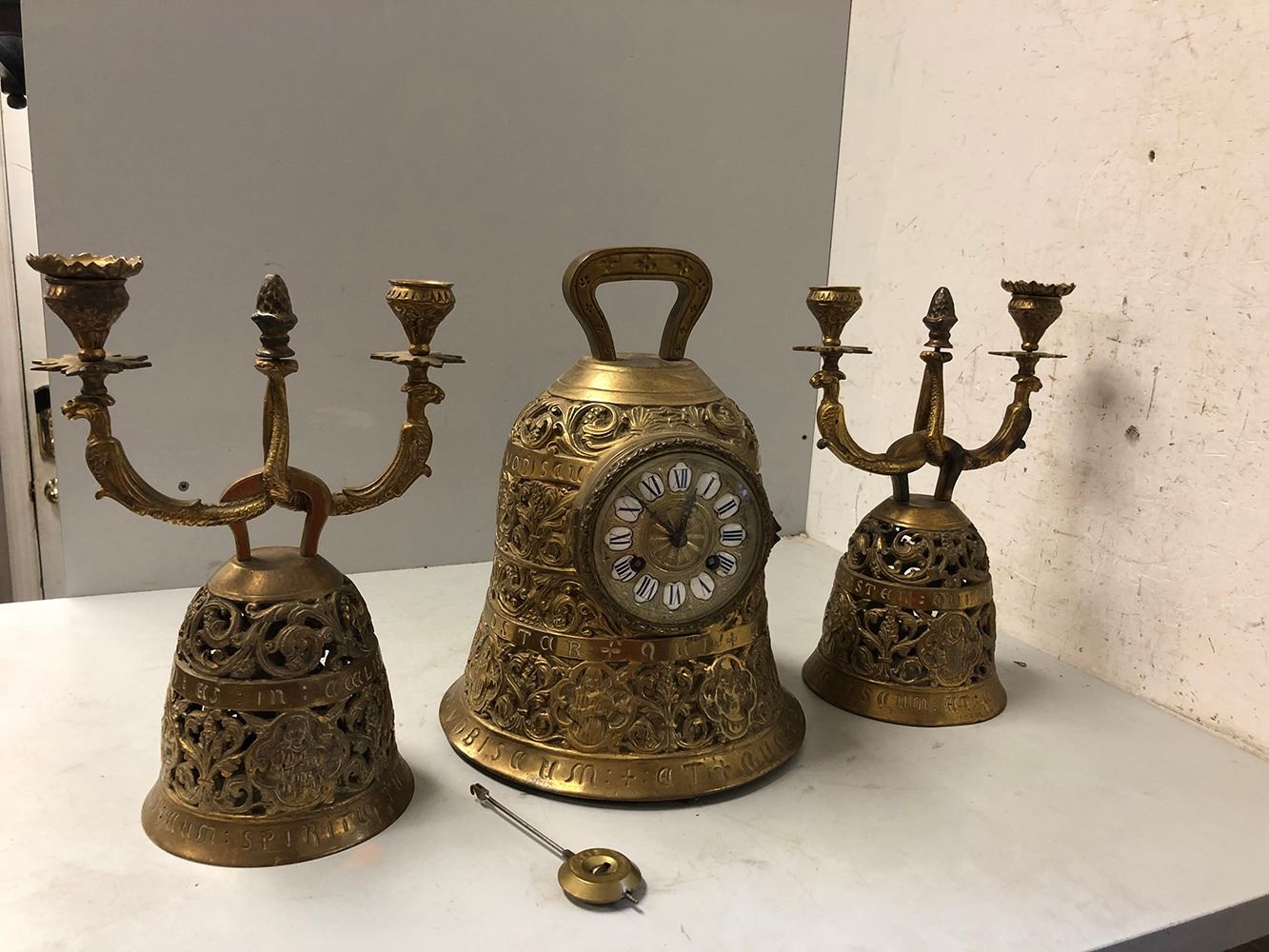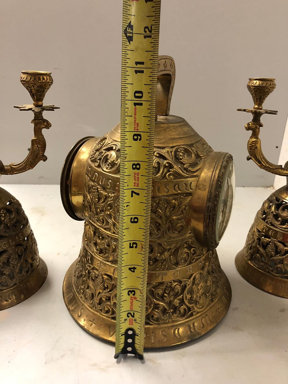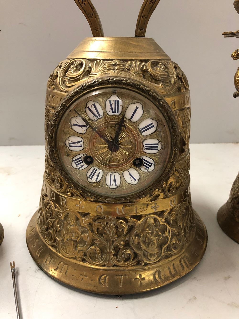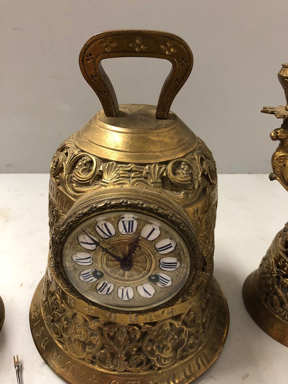 Monumental bell shaped 3 piece French bronze clock mental set with matching bell shaped candelabras. All over ornate and enamel dial, signed movement. Was in running condition at the estate. From the Chatham, Ma, Cape Cod Collection.