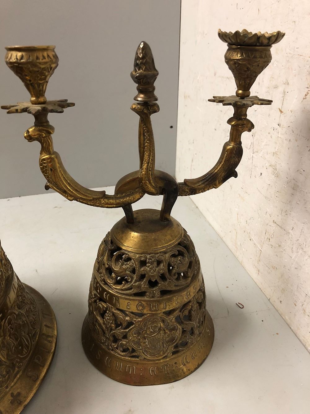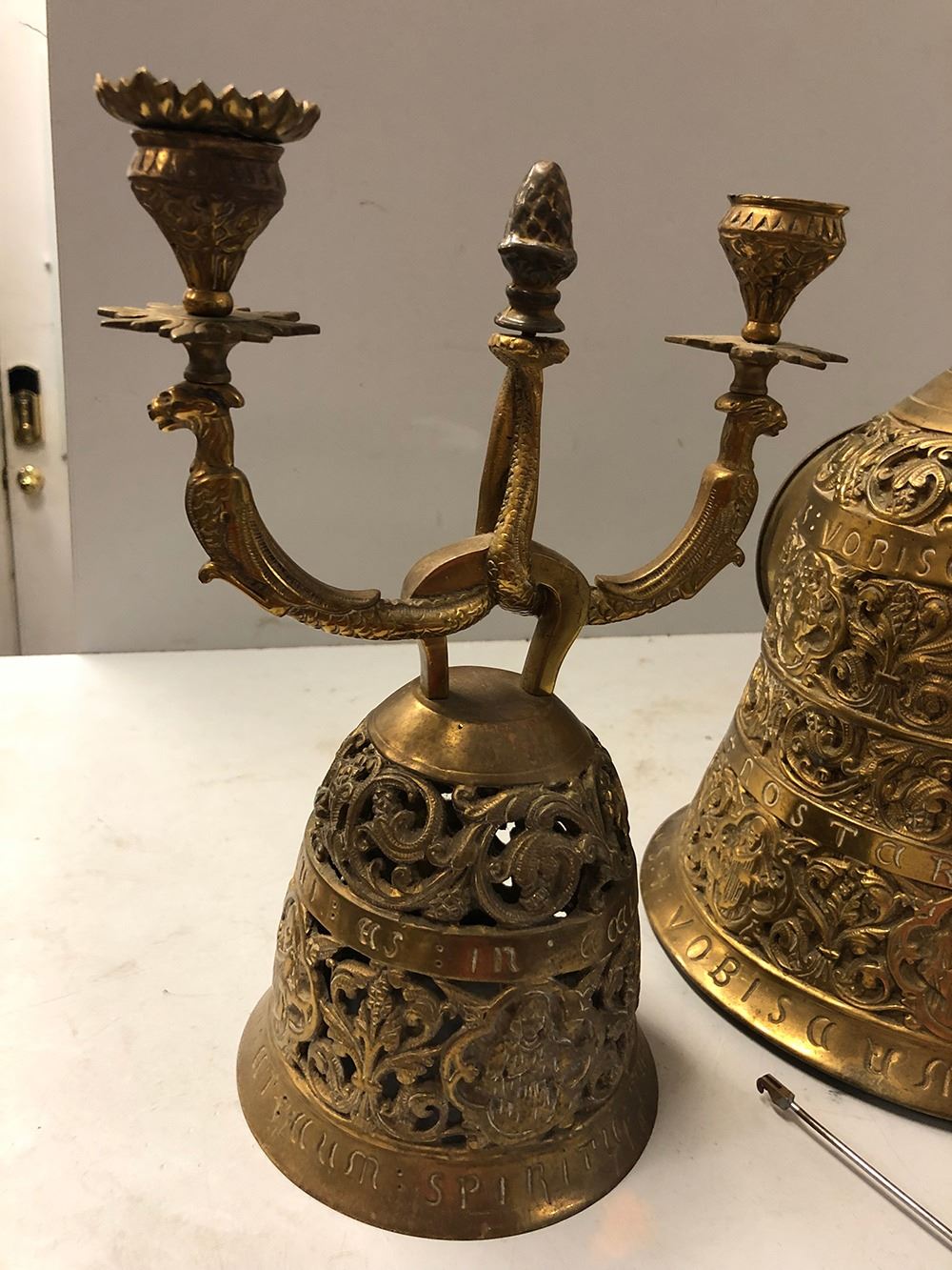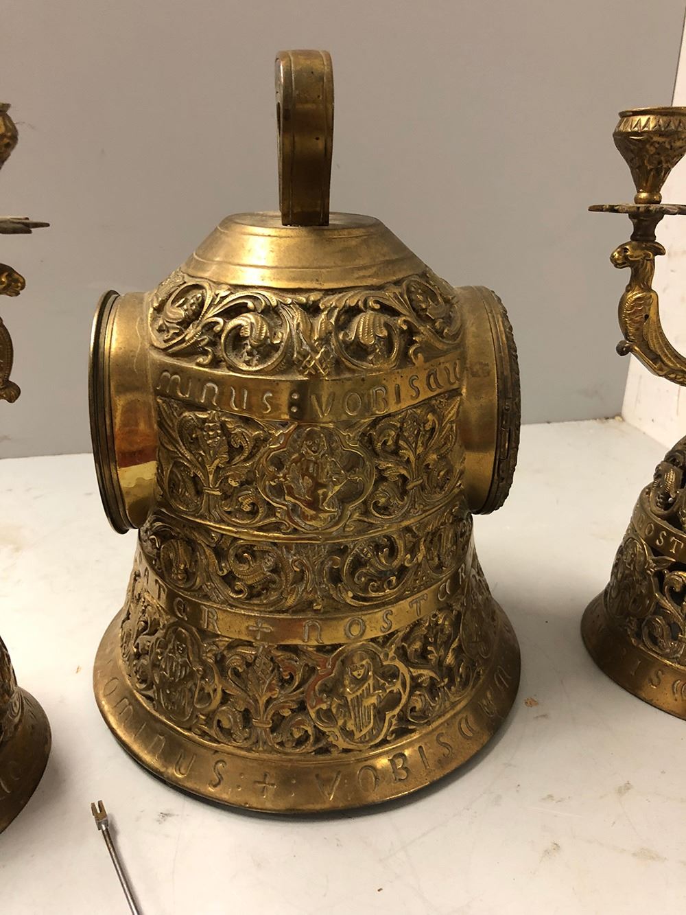 Monumental bell shaped 3 piece French bronze clock mental set with matching bell shaped candelabras. All over ornate and enamel dial, signed movement. Was in running condition at the estate. From the Chatham, Ma, Cape Cod Collection.