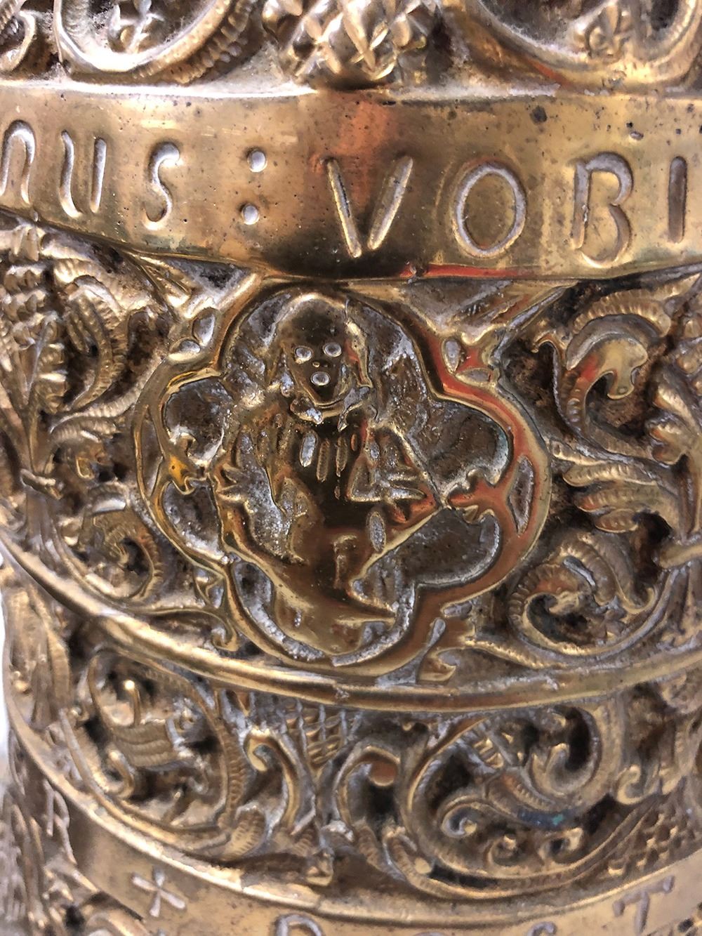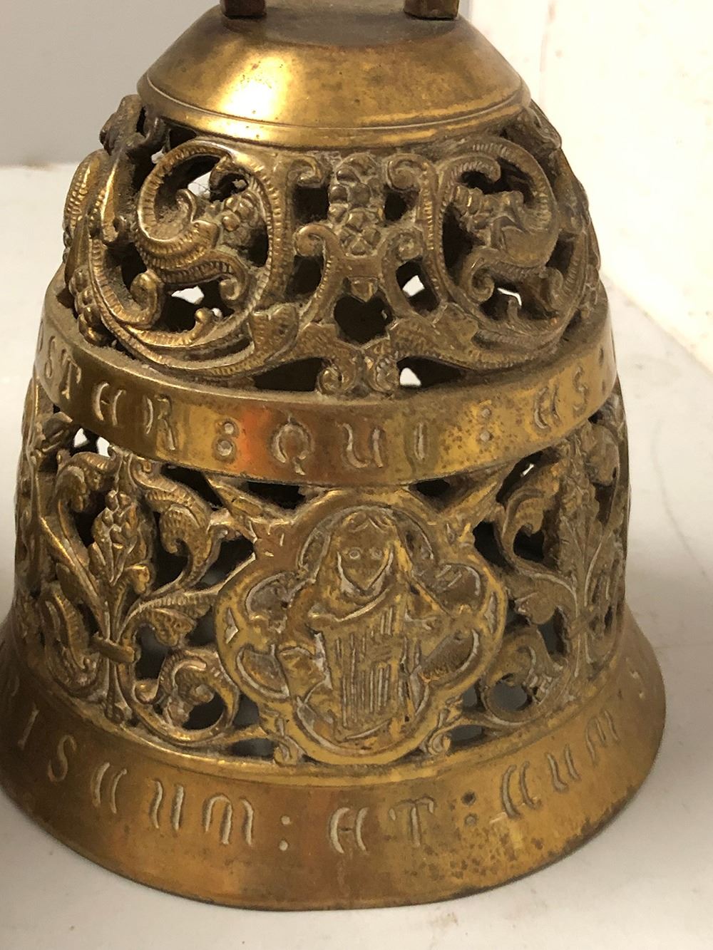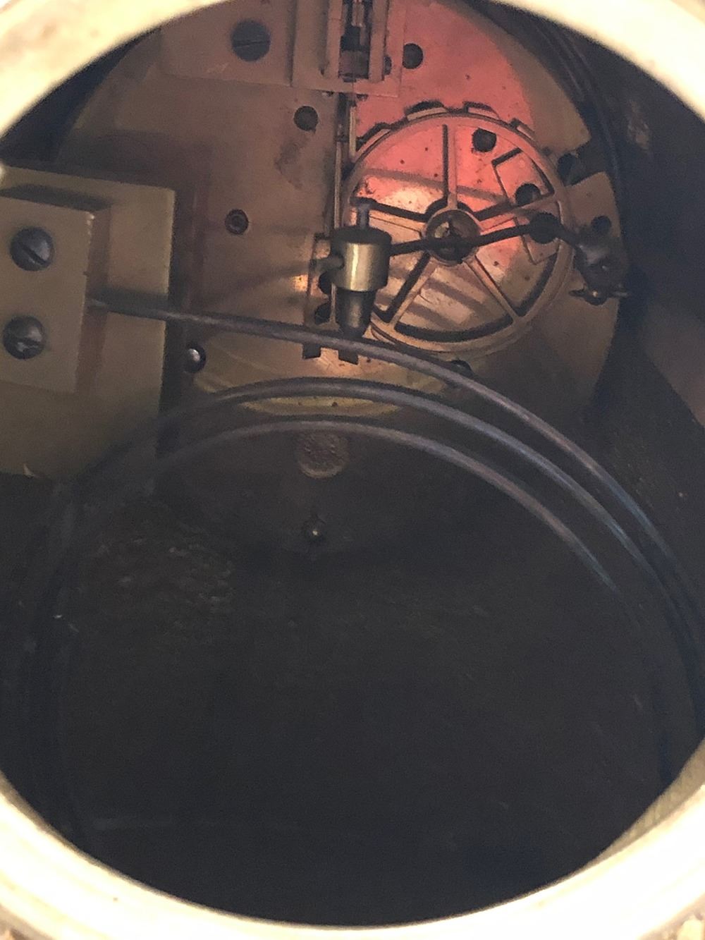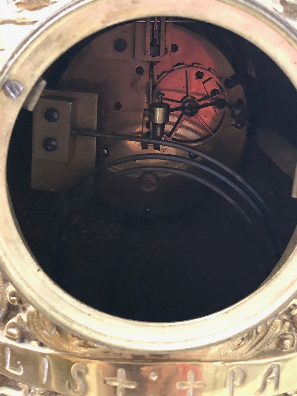 Monumental bell shaped 3 piece French bronze clock mental set with matching bell shaped candelabras. All over ornate and enamel dial, signed movement. Was in running condition at the estate. From the Chatham, Ma, Cape Cod Collection.