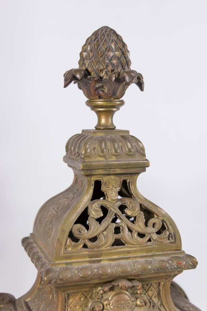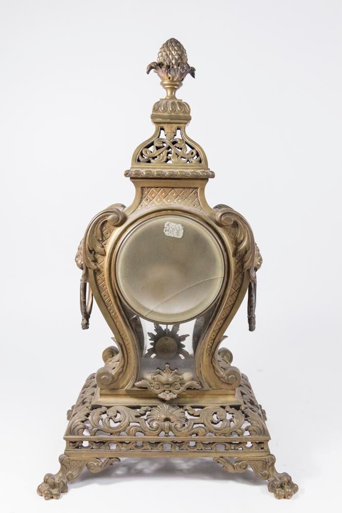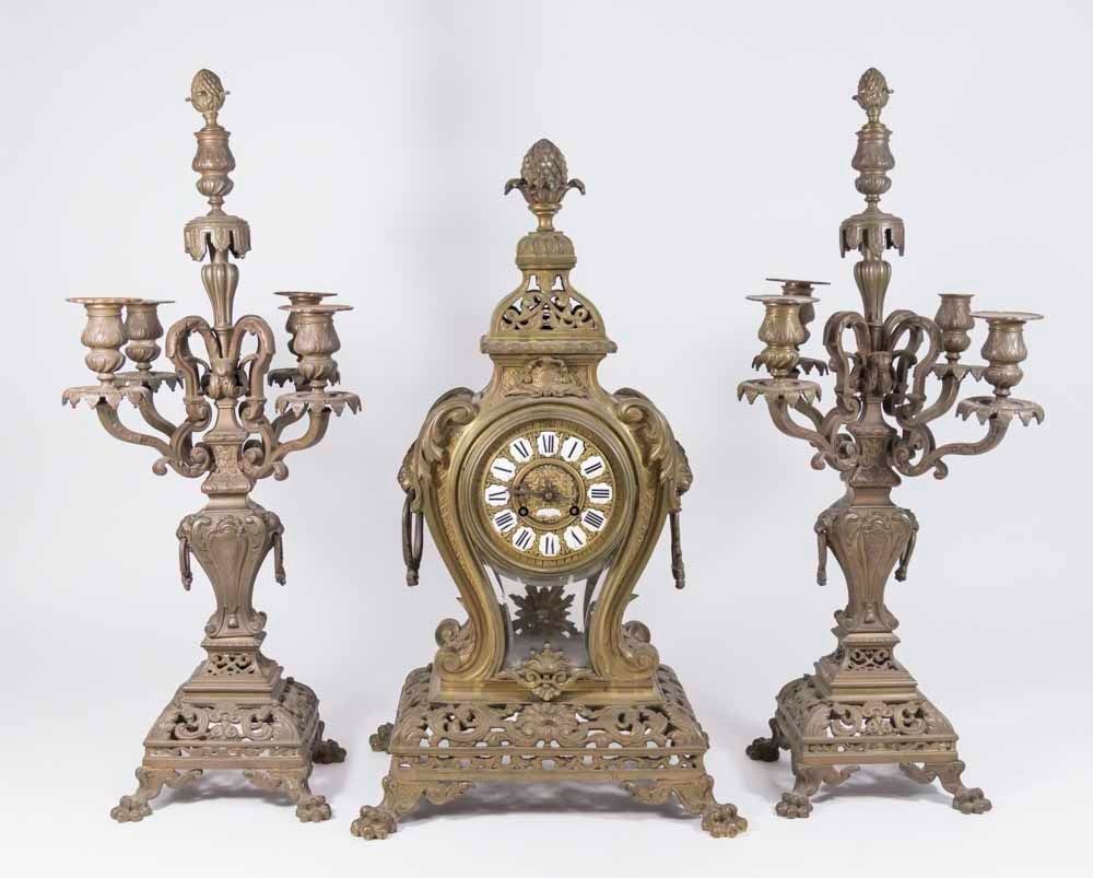Clock with plaque on front, approx. 22 1/4" H. Candelabra approx. 22 1/2" H. Glass cracked on back cover and panel. One drip cup missing.