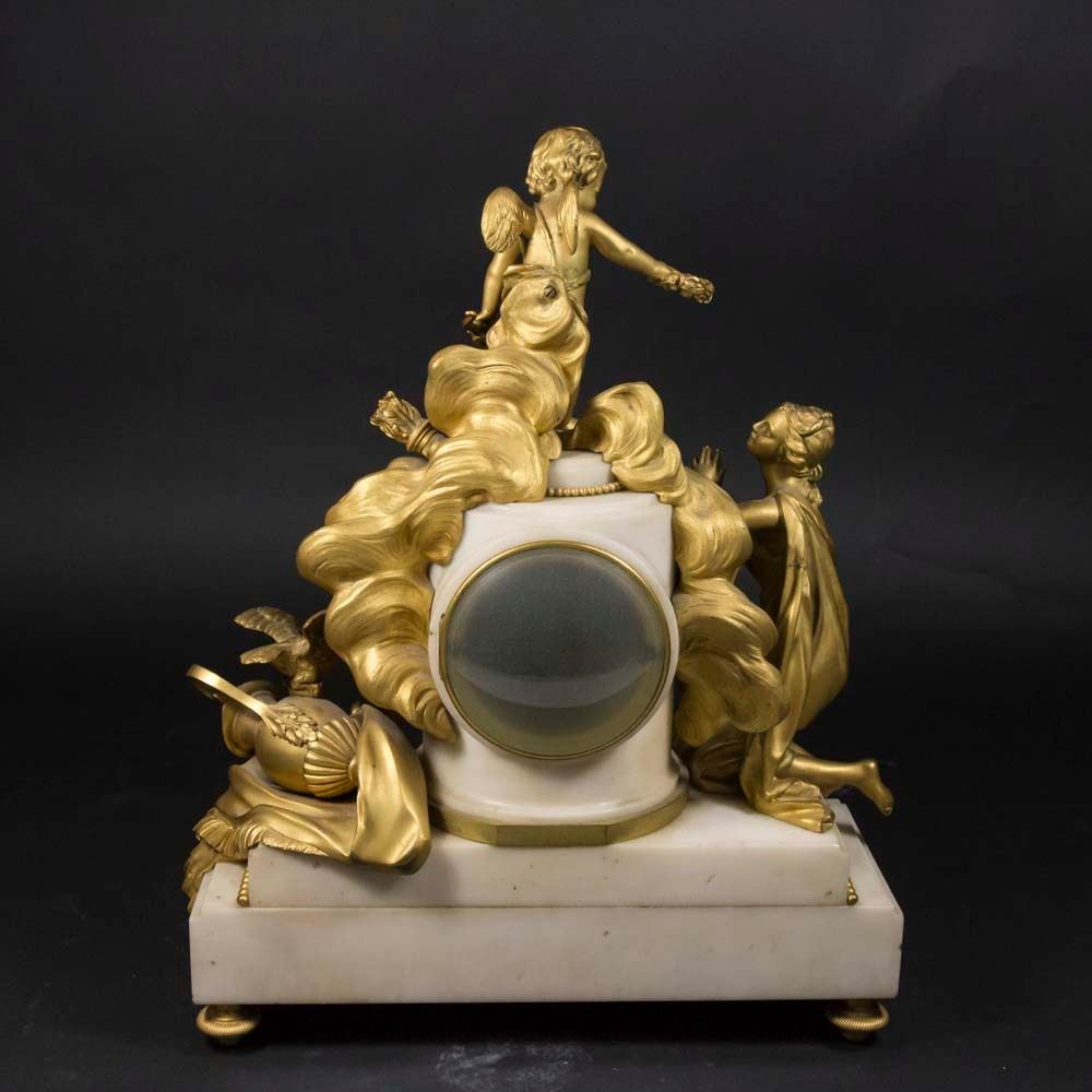 Clock depicting lady and cherub with doves. Pair of floral urns with rams heads. S. Marti-medaille d'or 1889. Retialed by Black Starr & Frost. French late 19th/early 20th century. Fine quality. Clock measures 17"H x 13", Urn 21"H Dial needs restoration