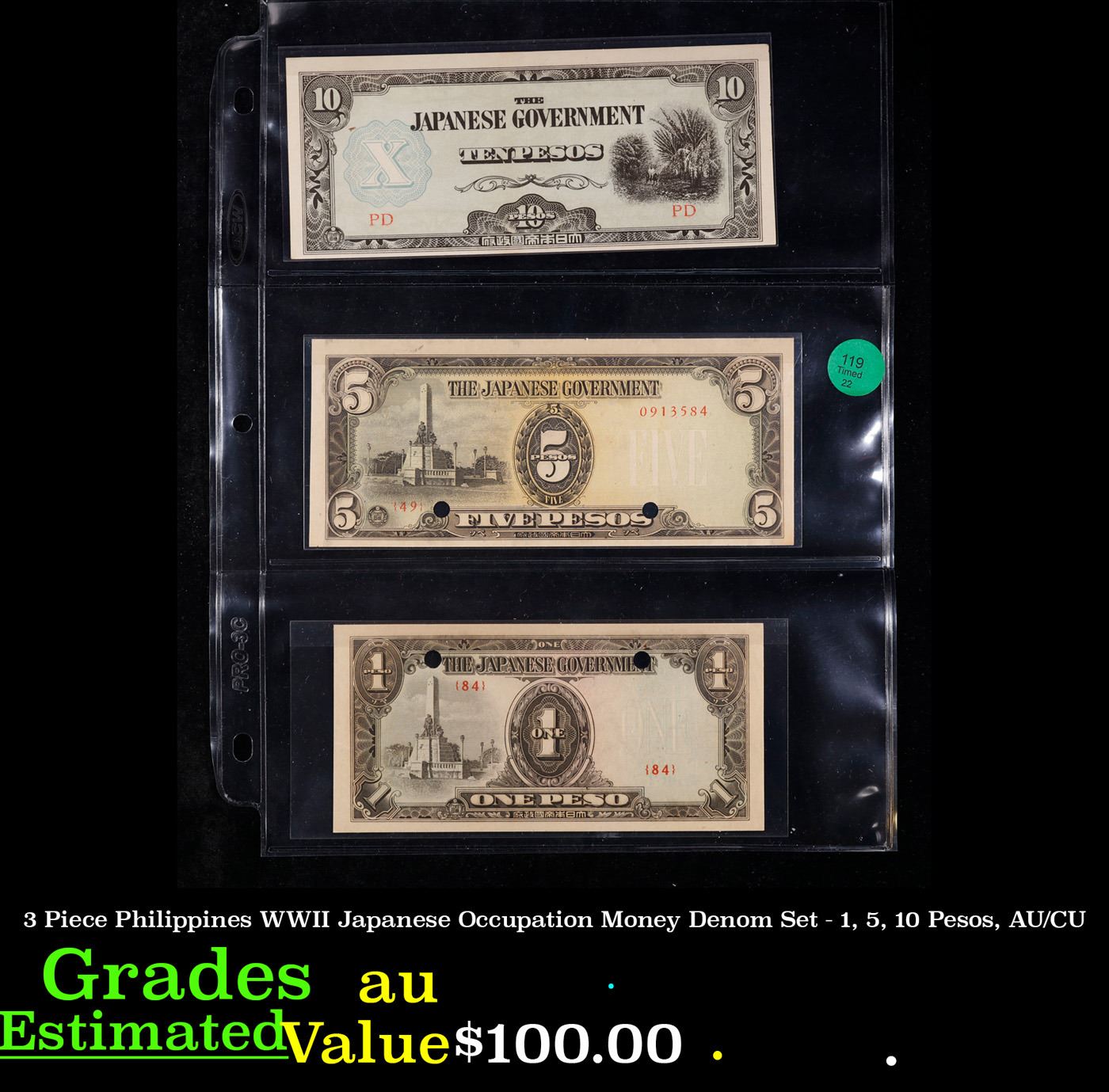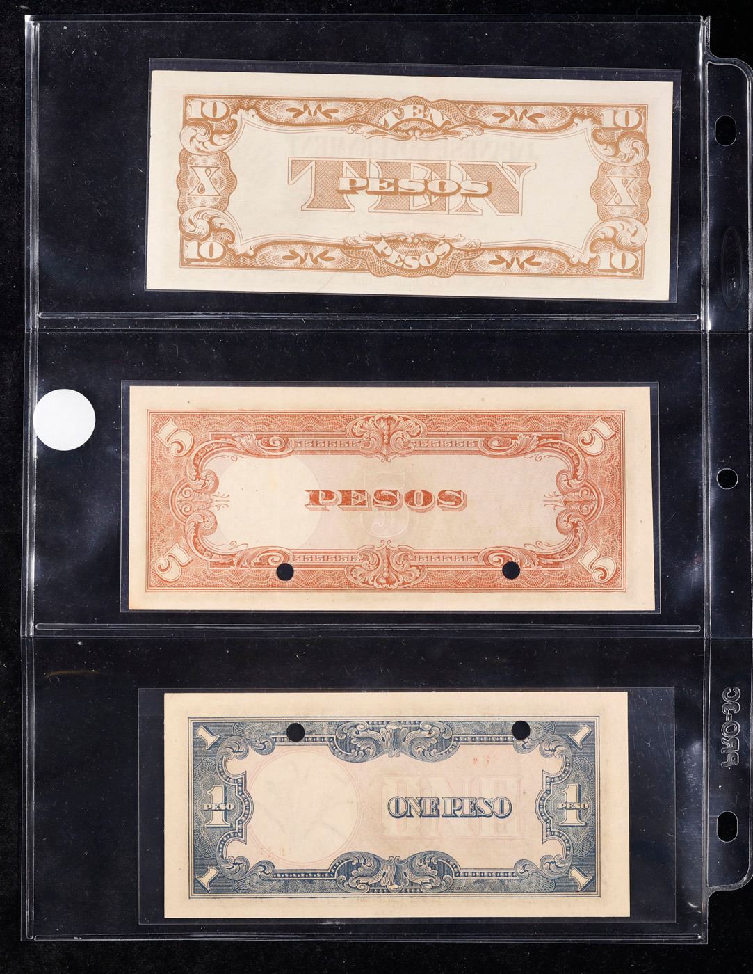 3 Piece Philippines WWII Japanese Occupation Money Denom Set - 1, 5, 10 Pesos, AU/CU Grades au.