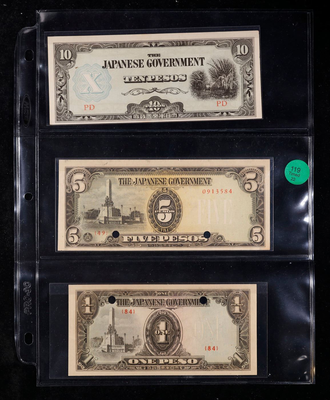 3 Piece Philippines WWII Japanese Occupation Money Denom Set - 1, 5, 10 Pesos, AU/CU Grades au.