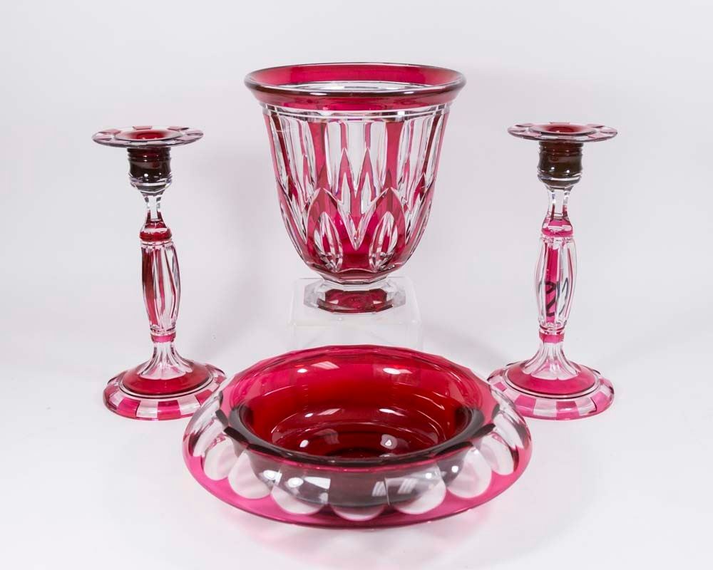 Crystal. Candlesticks approx. 12" H. Console approx. 13 1/2" D. Vase approx. 9 3/4" H. From an Edgewater, NJ estate. Chip on foot of large vase.
