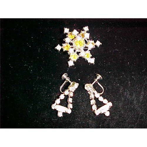 3 Piece Rhinestone Brooch & Earrings! Silvertone brooch with yellow and clear rhinestones. Dangling screw back earrings with clear rhinestones. Brooch is about 1.5" in diameter and earrings are about 1.25" long. Both in very nice condition.