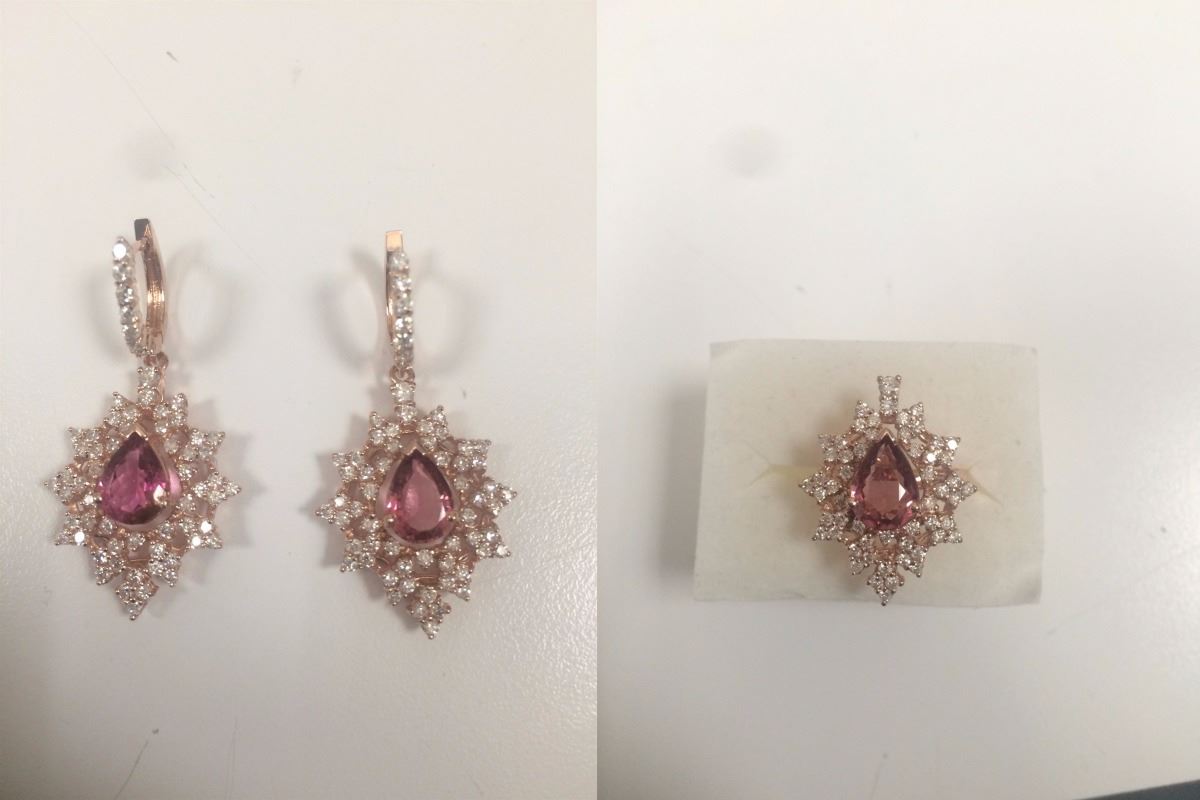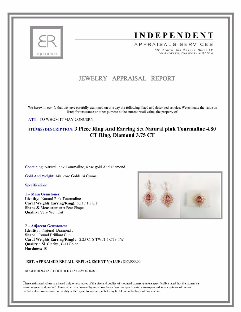 3 Piece Ring And Earing Set Natural pink Tourmaline 4.80 CT Ring, Diamond 3.75 CT 14k Rose gold:14 Grams Diamond:3.75 CT