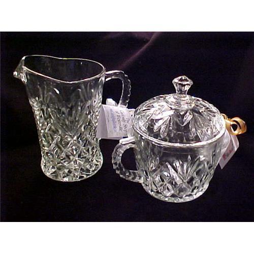 3 Piece Set Unsigned Milk Pitcher & Covered Sugar Bowl. Lovely diamond and wheat pattern. Milk pitcher is 7" high and diameter of large sugar bowl is 3.5 inches inside rim. Great handles. I do not know the maker, but it has to be one of the good ones. Very usuable and not just pretty!