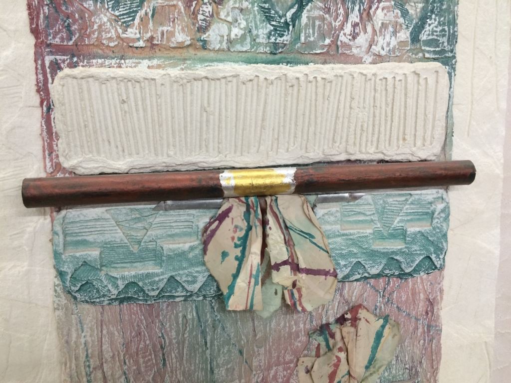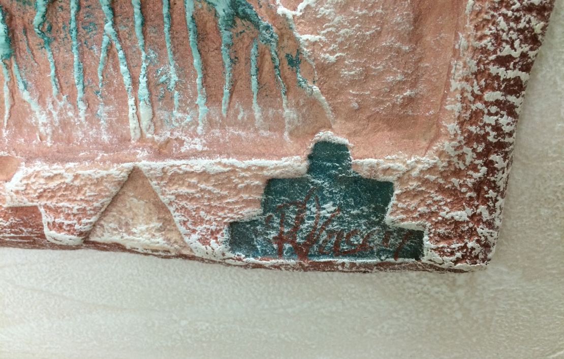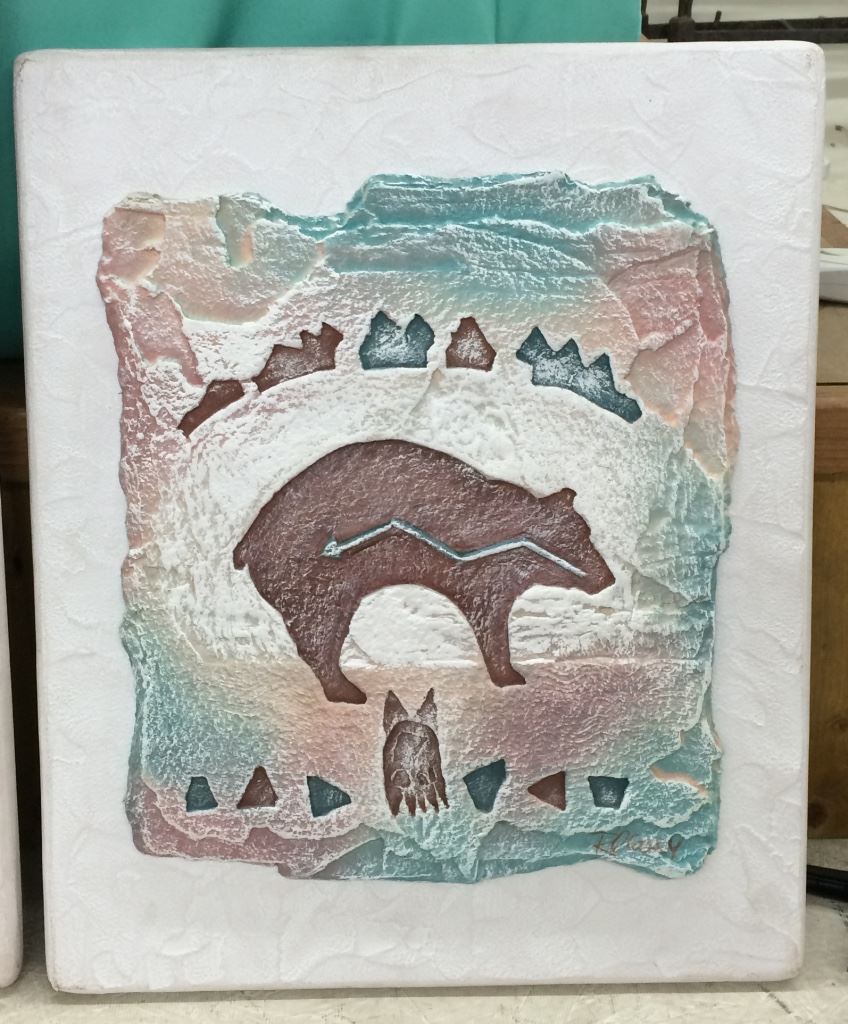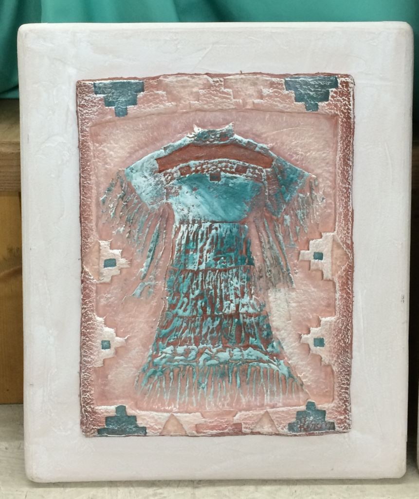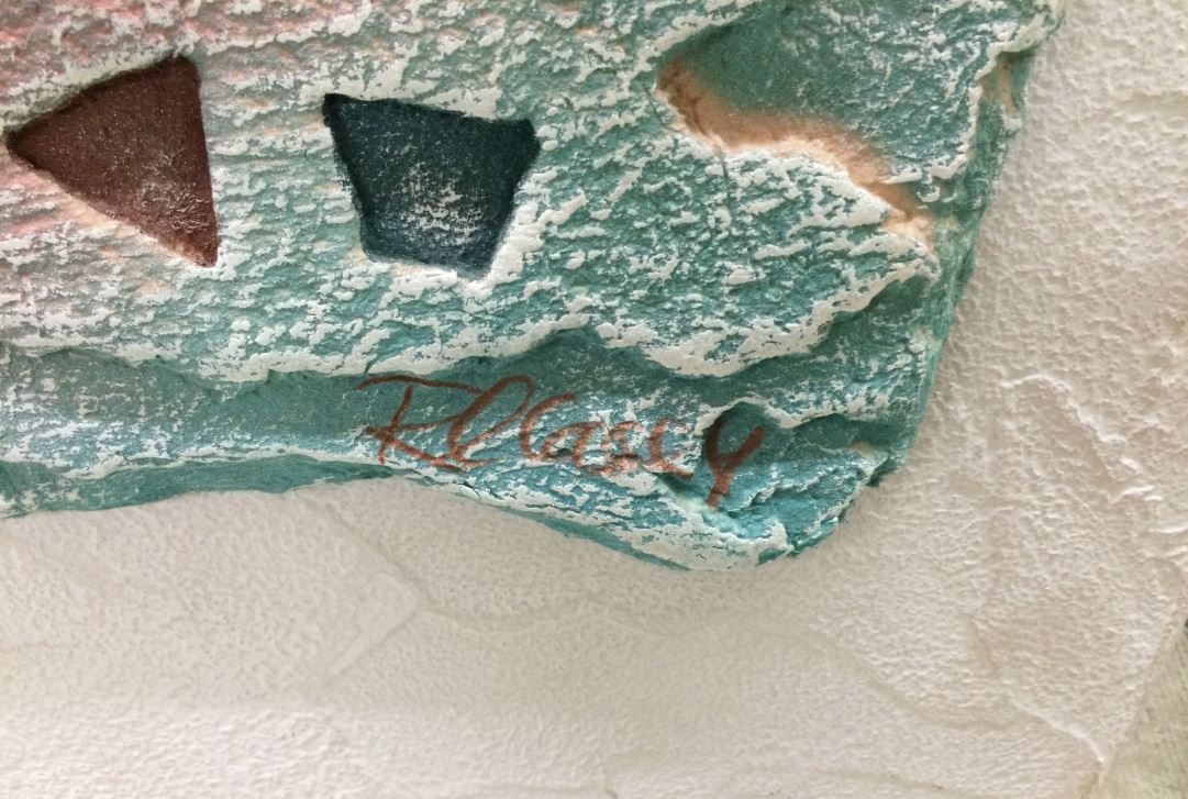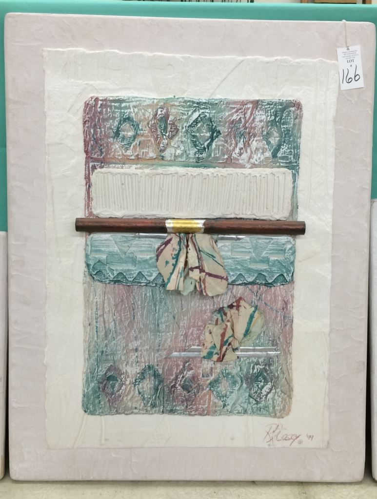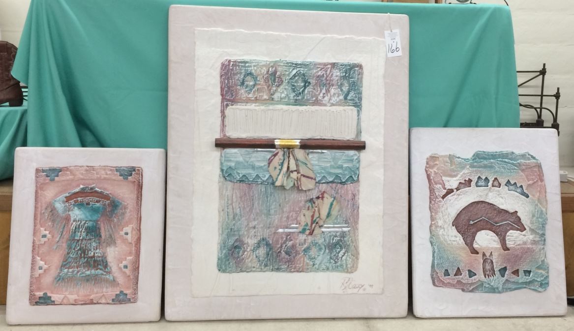This 3 piece mixed media set is by the renown Arizona artist, Michael Casey. The center piece picture is 36” X 46” and the medium picture is 24” X 29” and the smaller picture is 21” X 25”. A nice collage. They are all in good condition (there is a small ding in the edge of the larger one).