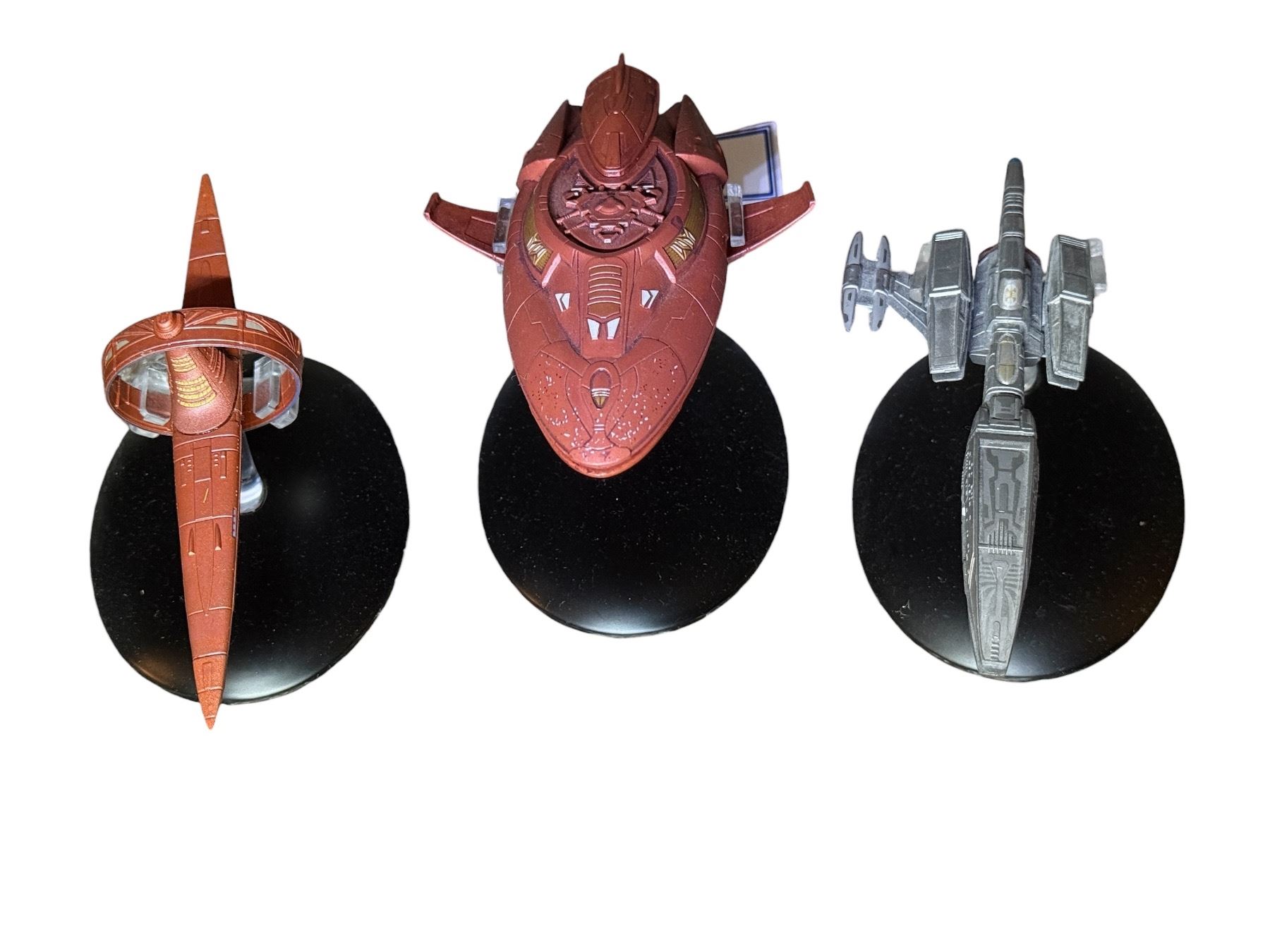 3 Piece Star Trek Starship Models - ANDORIAN WARSHIP 1890-A/C TM & © 2015 CBS Studios Inc. , VULCAN SURVEY SHIP 0010-A/B TM & © 2018 CBS Studios Inc. SURAK CLASS 4581-A/F TM & © 2017 CBS Studios Inc , with base & stand. DOESN'T INCLUDE BOX(ES)