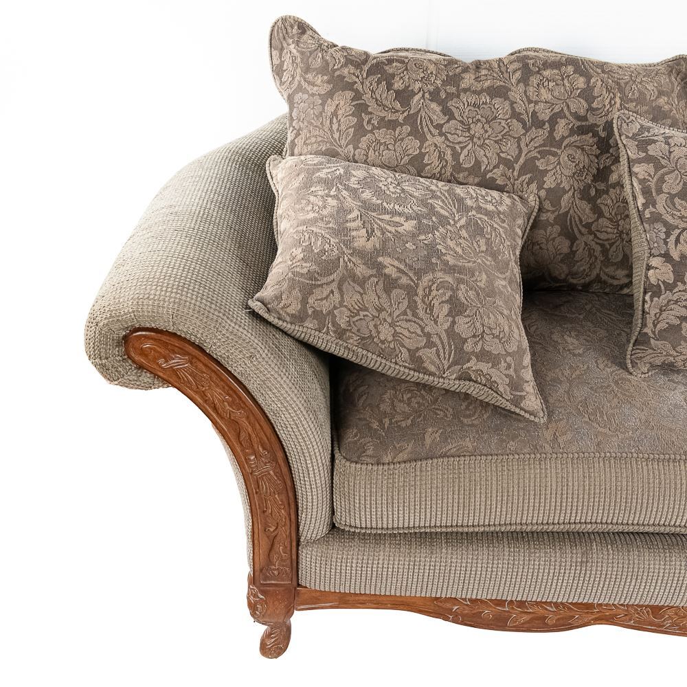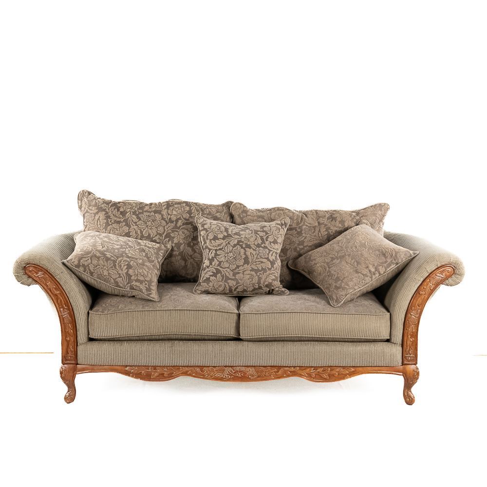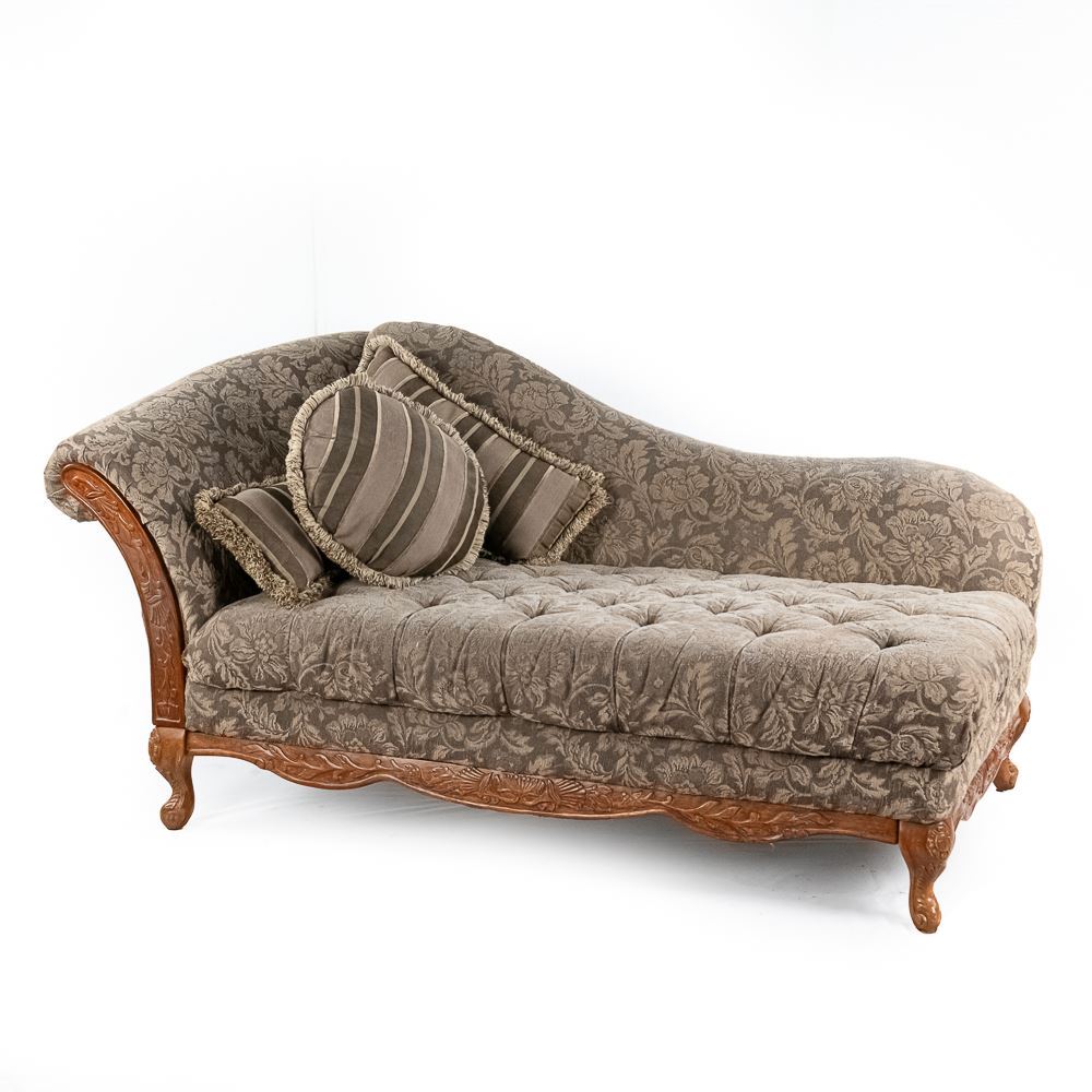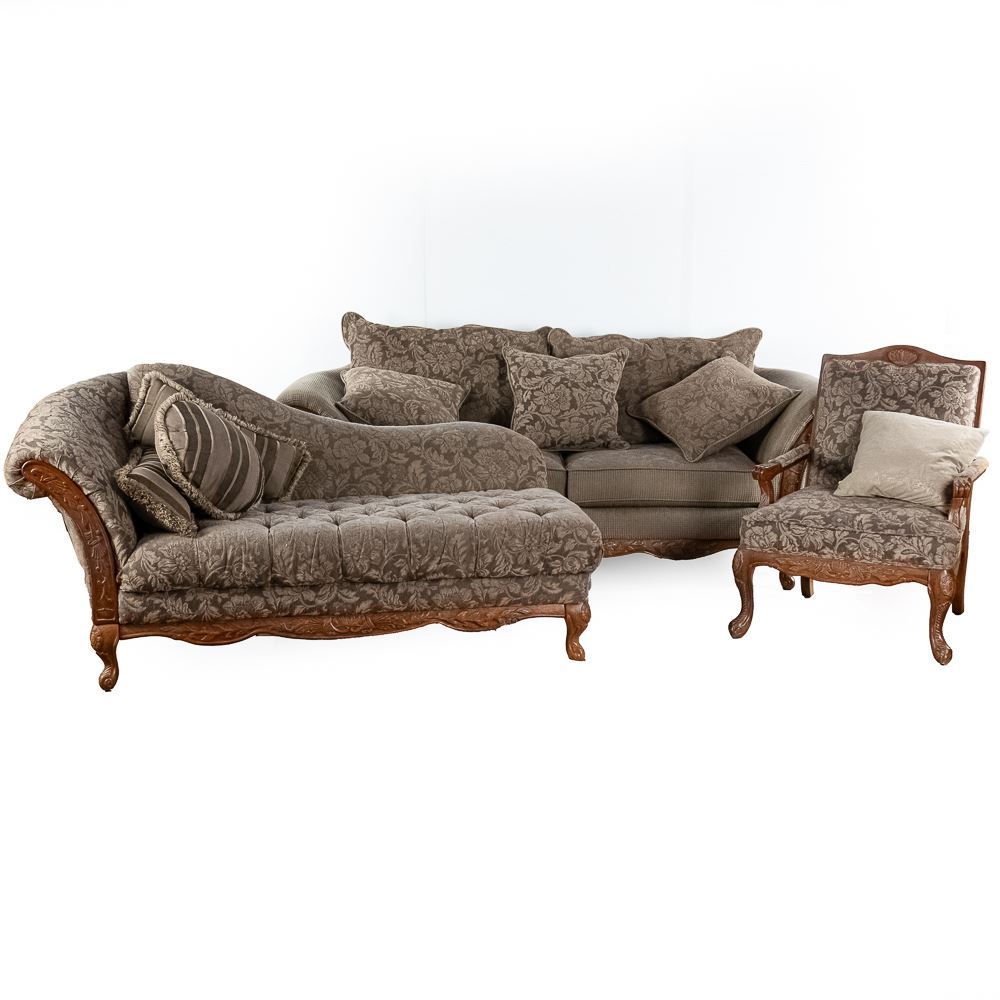 Very nice high end contemporary made Victorian style matching upholstered sofa, fainting couch, and arm chair. Couch measures 96" wide, fainting couch is 80" wide. All pieces have carved wood frames and curved feet. Upholstery is clean with no stains and has seen little use. The set is ready to go. Comes with all cushions and throw pillows.