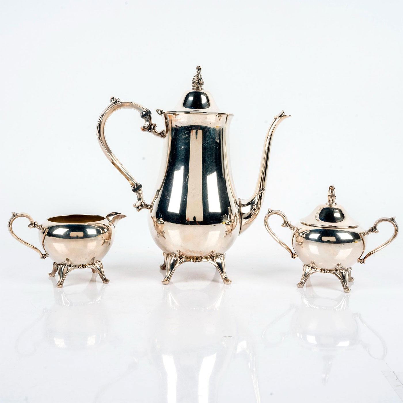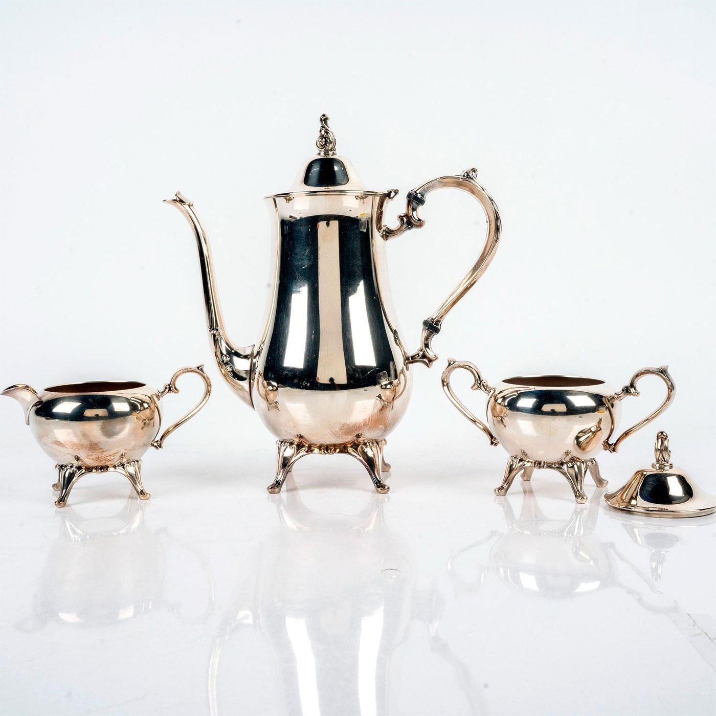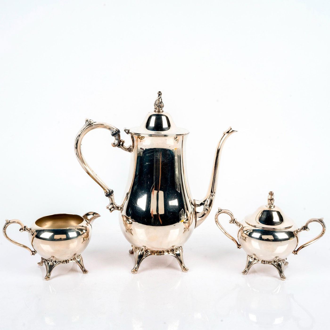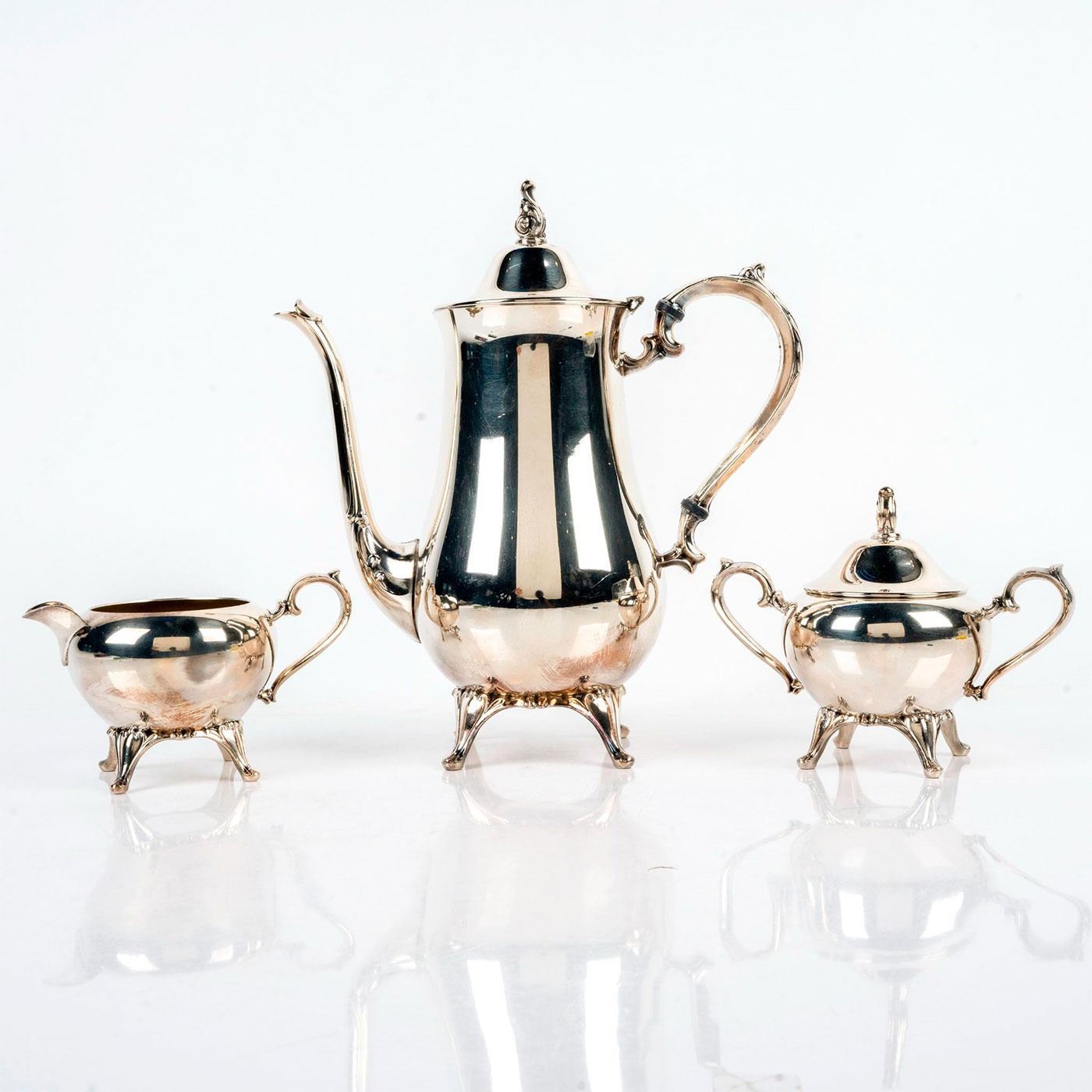 Includes teapot, creamer and sugar bowl. WM Rodgers backstamp. Teapot 11" H, creamer 5" H, sugar bowl 3" H.