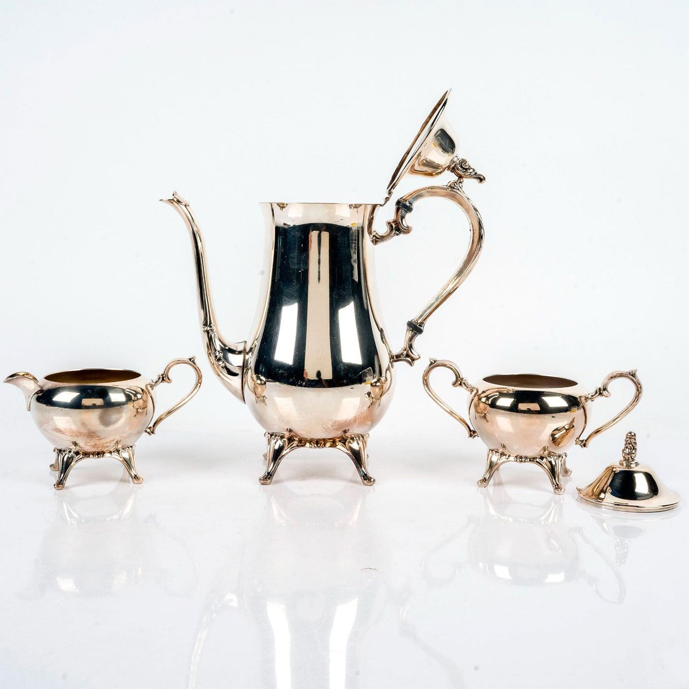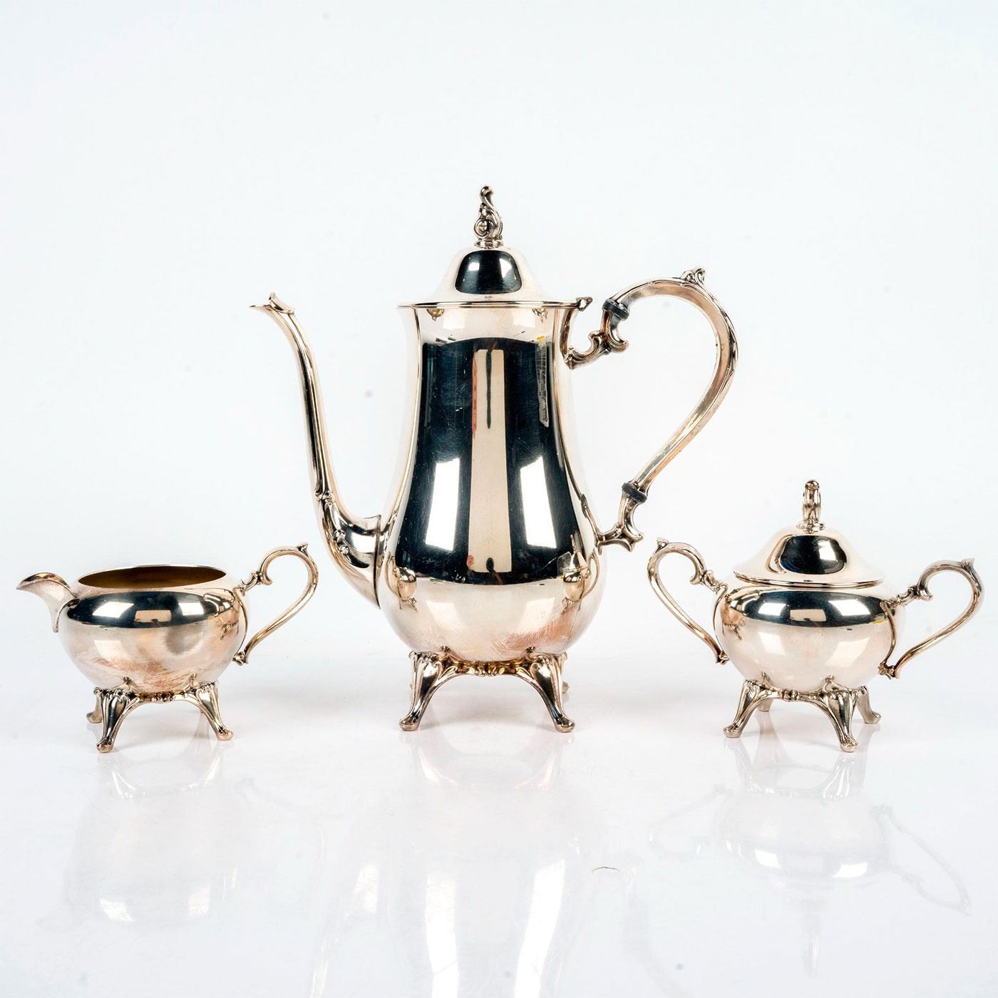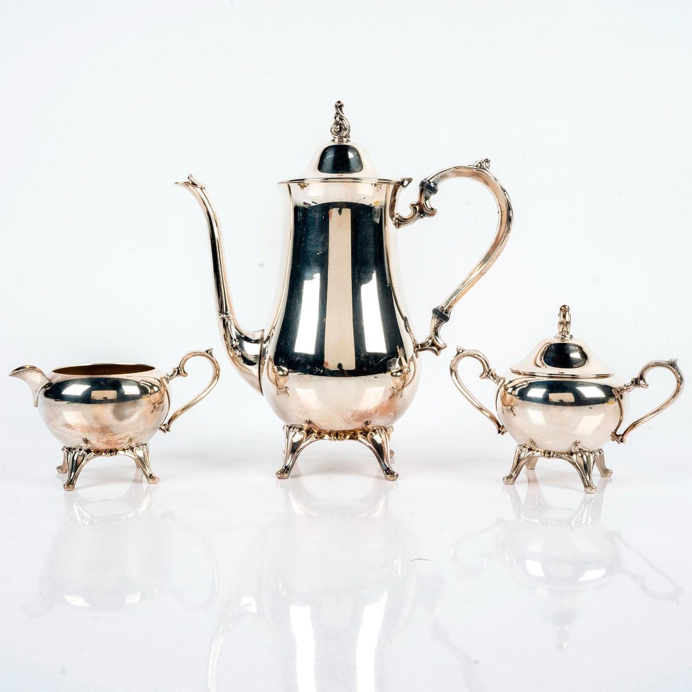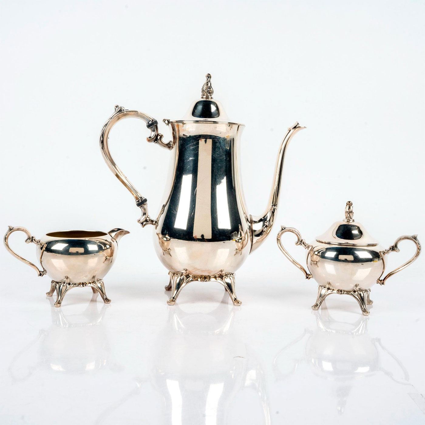 Includes teapot, creamer and sugar bowl. WM Rodgers backstamp. Teapot 11" H, creamer 5" H, sugar bowl 3" H.