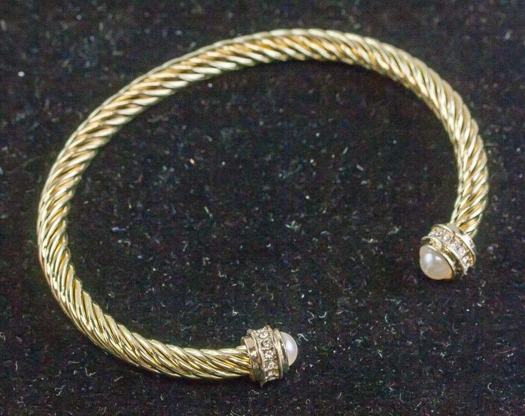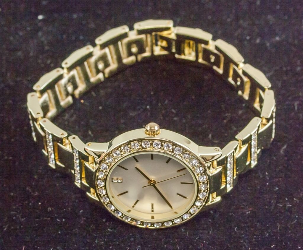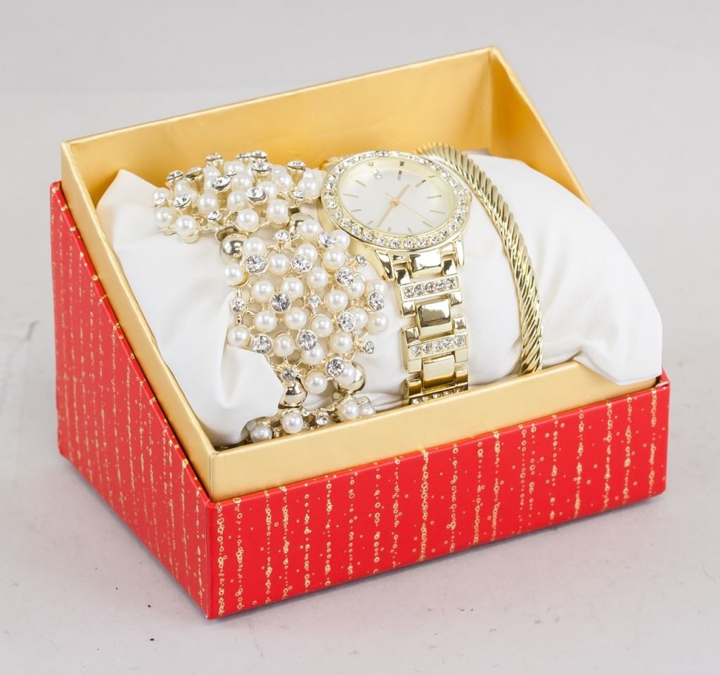 Three (3) assorrted jewelry in gift box. Two bracelets and a watch. 8 cm. 7 cm. 9.5 cm. Box: 9 x 12 cm. 244 grams