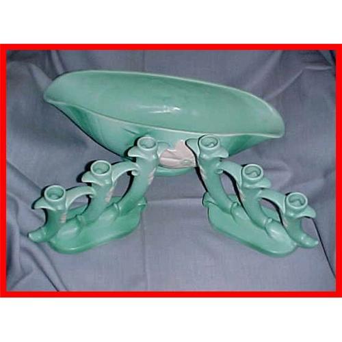 This listing consists of a three piece console set by Weller Art Pottery. The set consists of a 17-1/2" long console bowl and two 9-1/4" long candlestick holders. The candlestick holders are in good condition with slight scuffing. The console bowl is in fair condition beause of the 3/16" long glaze flake on the rim, tight hairline on the other end and a slight flake on the unglazed bottom foot(Nothing Major). A nice large console set by a desirable American Art Pottery Company!