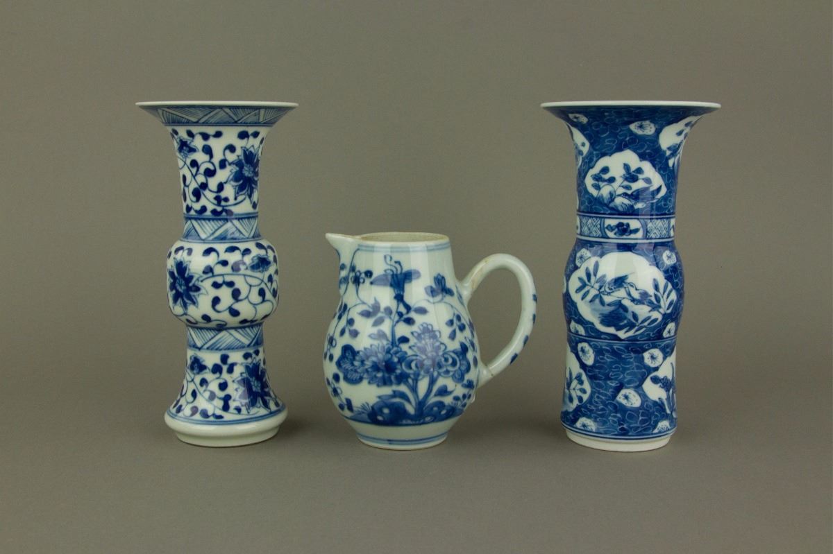 Three pieces of Chinese blue and white porcelain vases; comprised of two Gu-shaped vases and one handled ewer; painted with lotus scrollwork and floral sprays on body; six-character Kangxi mark and double-circle mark on base; H: 16.3 cm, D: 8.3 cm, 656 grams