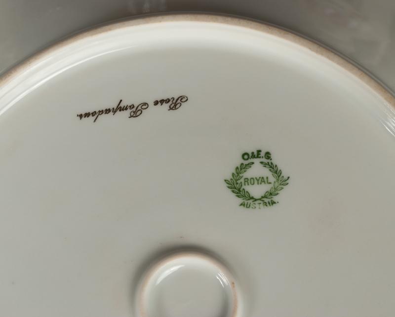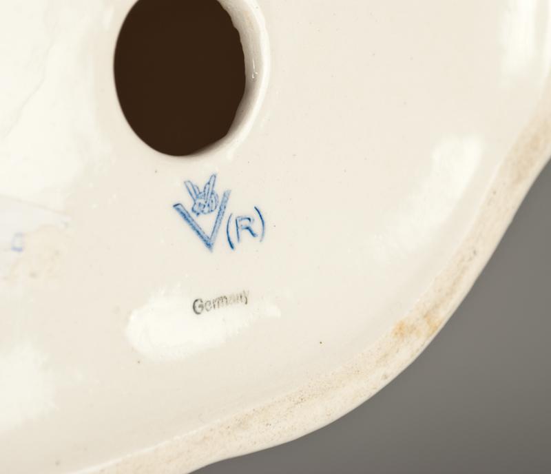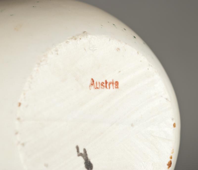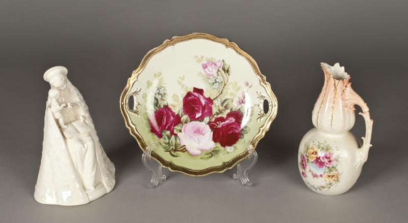 To include a white glazed mary and jesus, marked Germany,9"H, a Austrian handled pitcher with hand painted floral decoration, 9"H, and a handled plate, signed Royal Austria, with painted roses, 10.5"W, circa early 20th century.
