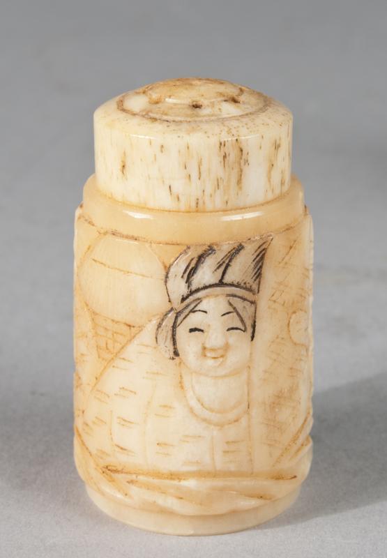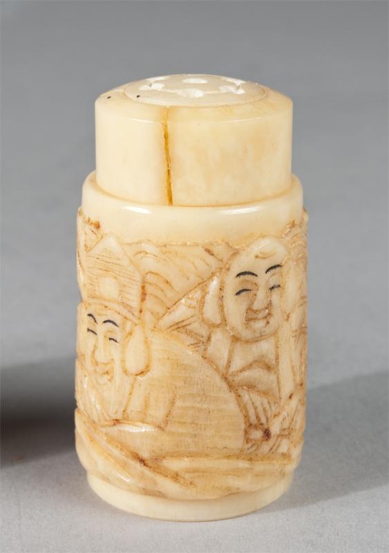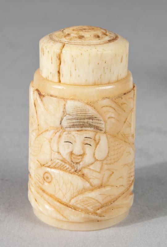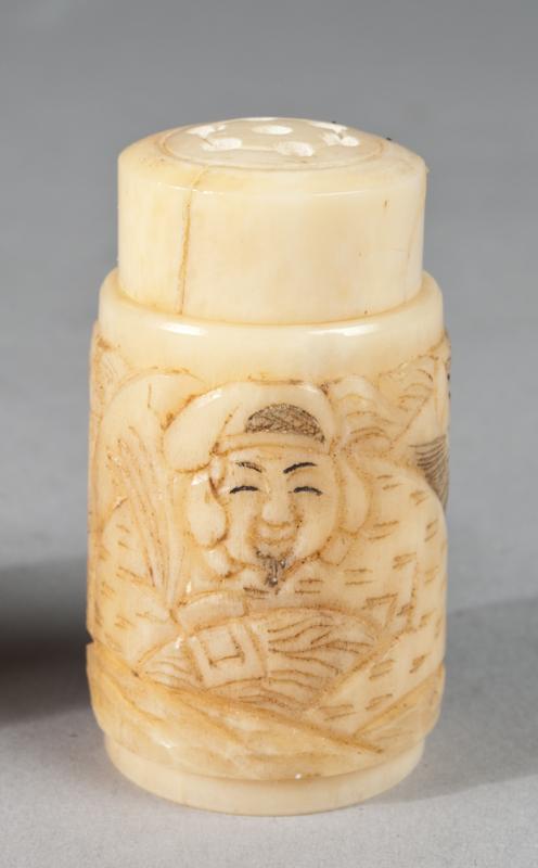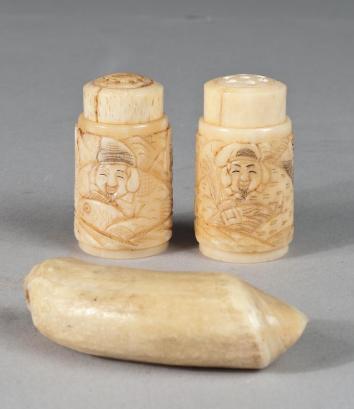 Including a pair of salt and pepper shakers with carved figures, an a bone pendant, 2.25"H, circa 20th century.