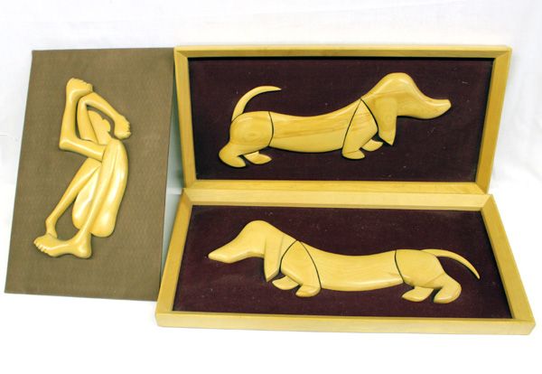 3 Pieces Unique Wood Art Pictures. These unusual pictures include 2 Framed Dachshunds and one unframed shy posed person. Dogs measure approx. 11.25''H x 23.25''W. Frames are in matching wood.