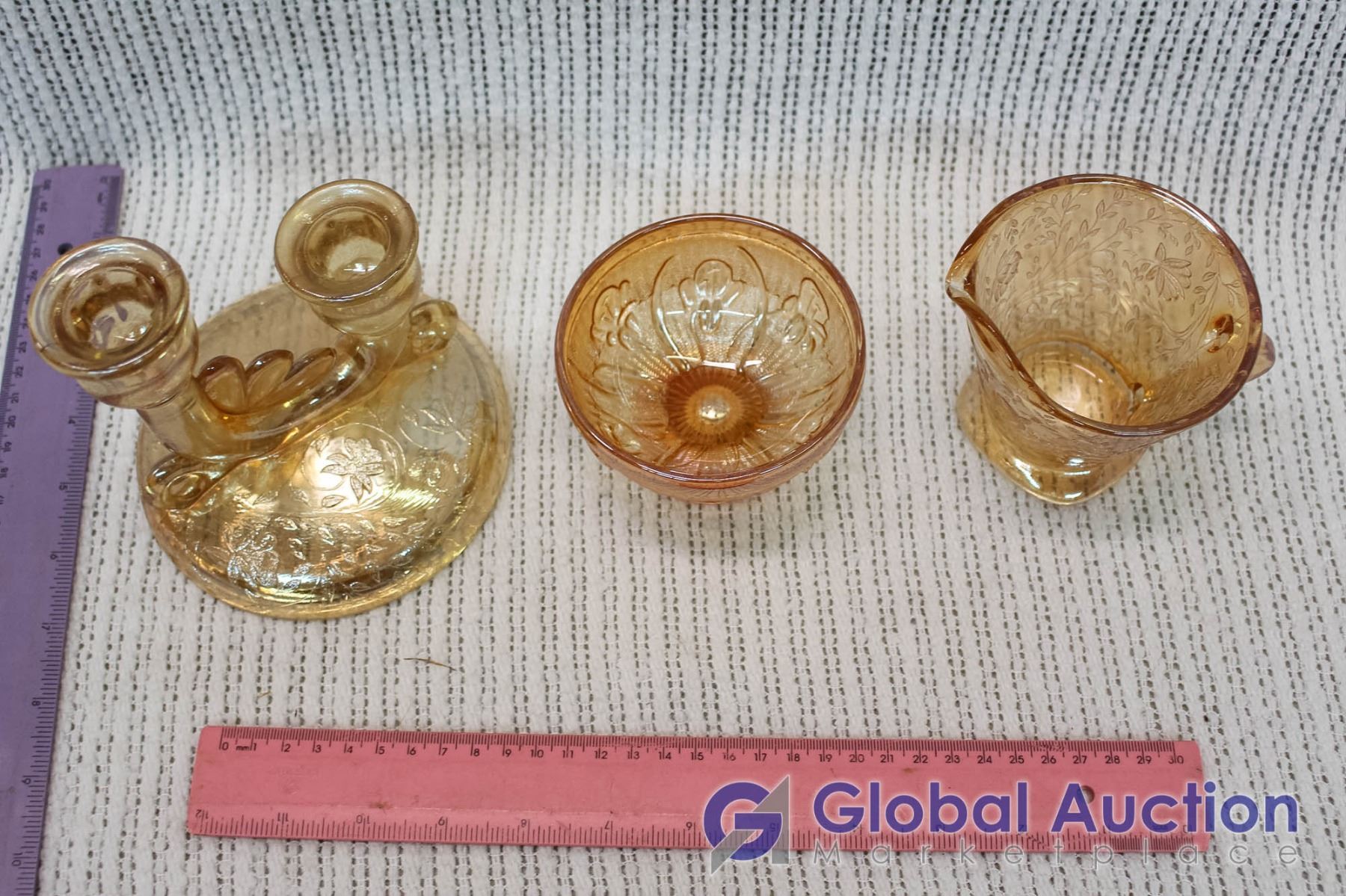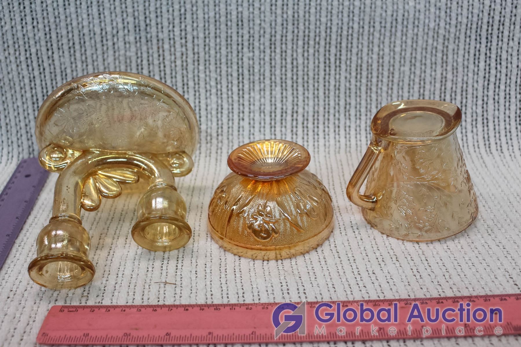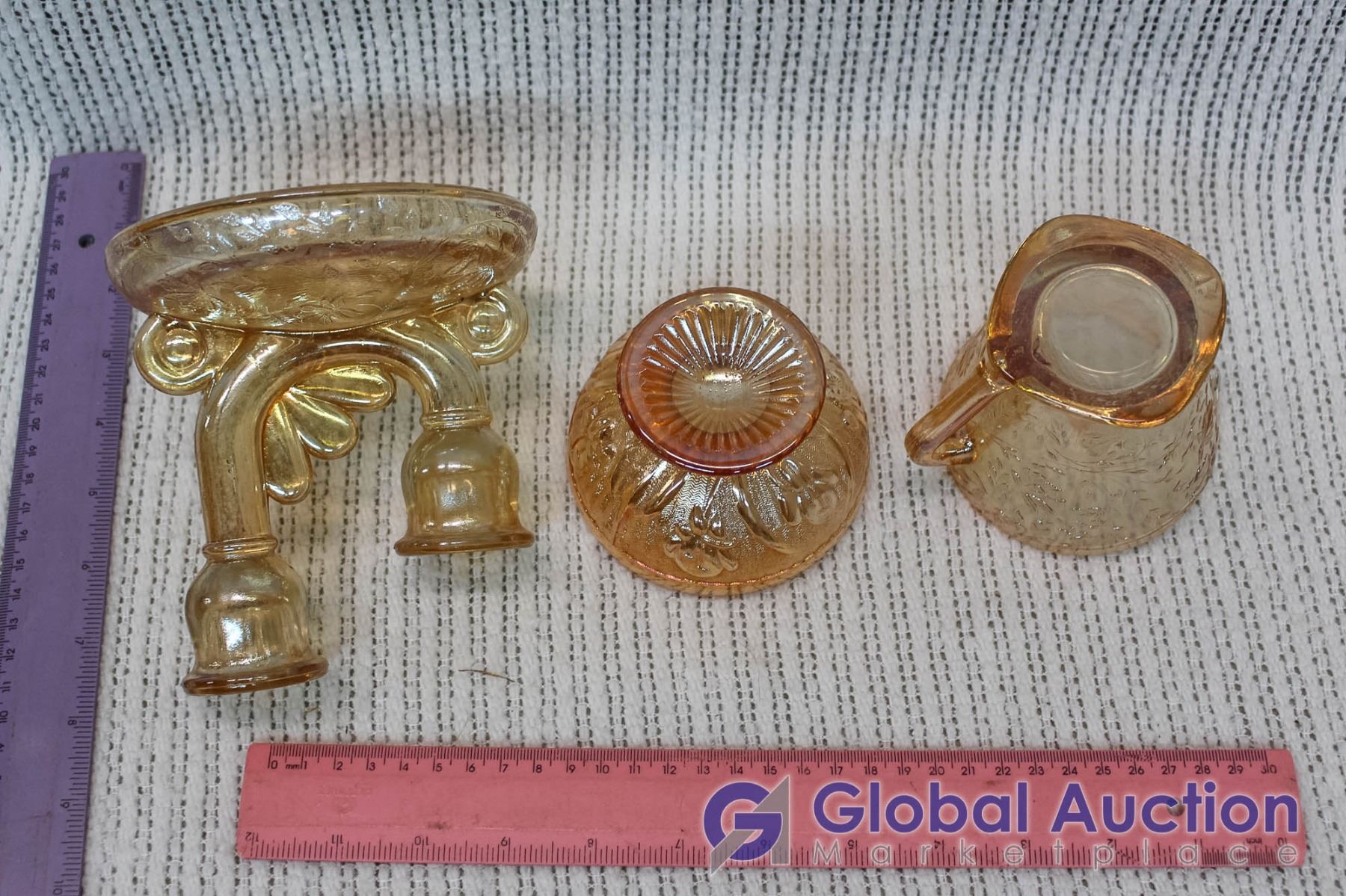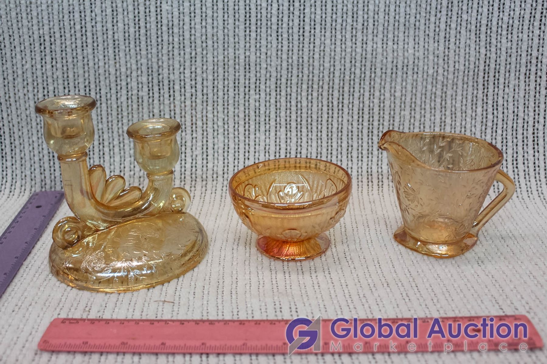3 Pieces of Amber Carnival Glass (Candlestick Holder, Cream Pitcher & Sugar Bowl)