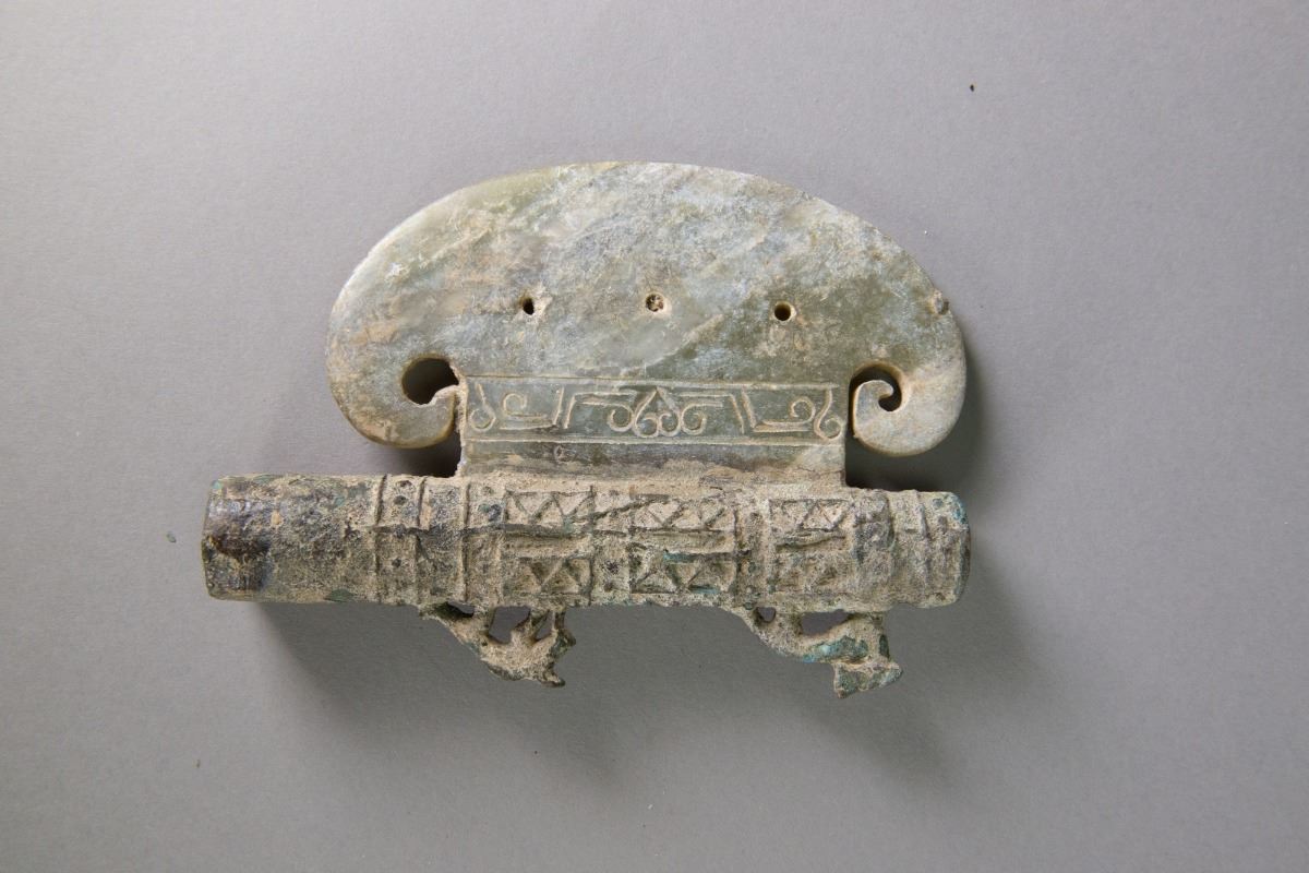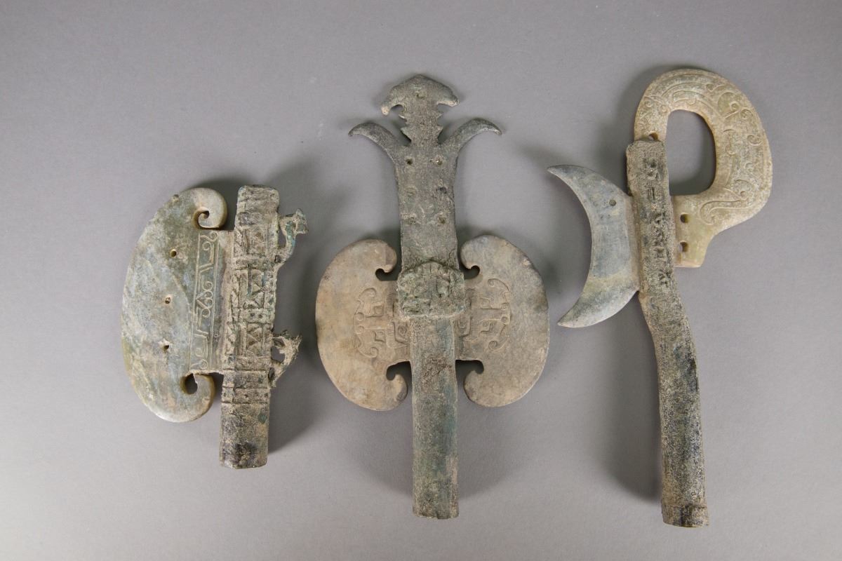 Three pieces of archaistic copper bronze jade weapons; comprised of bronze handles with jade blades; W: 15 cm, L: 30 cm, 420 grams each
