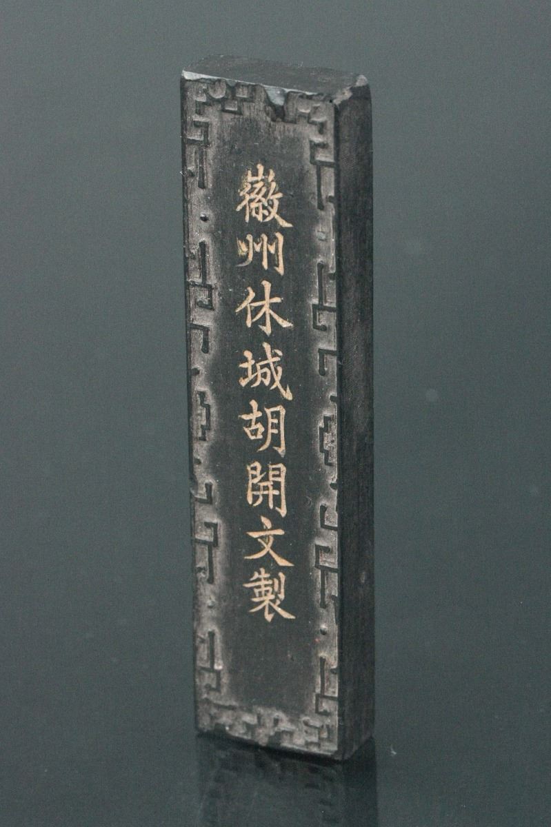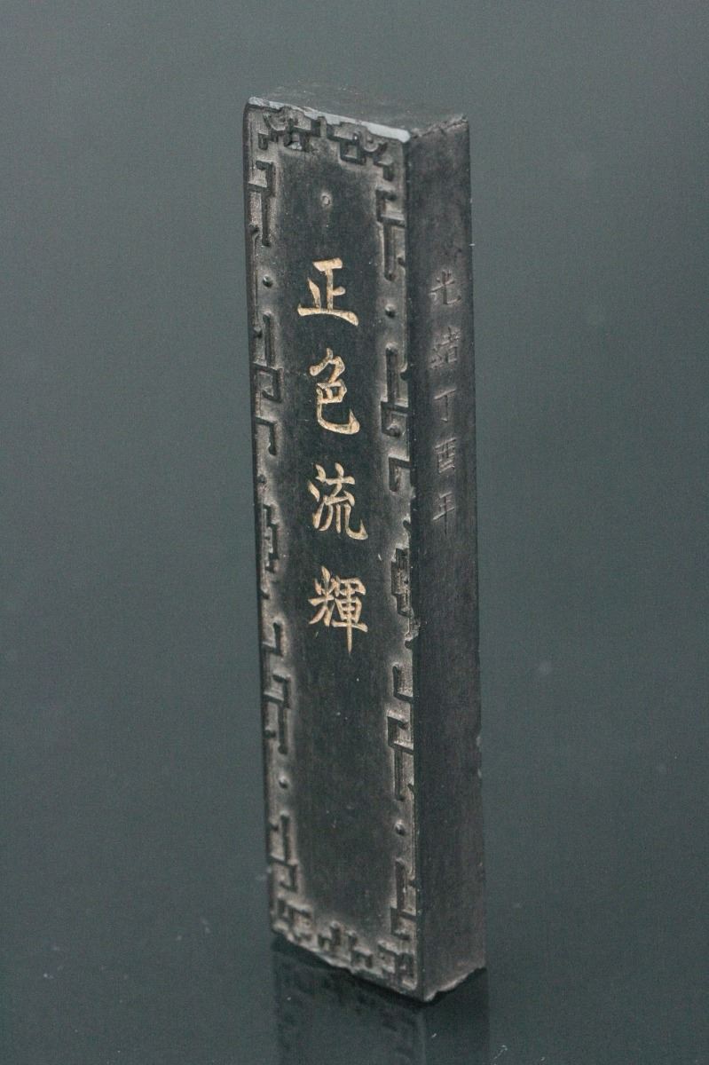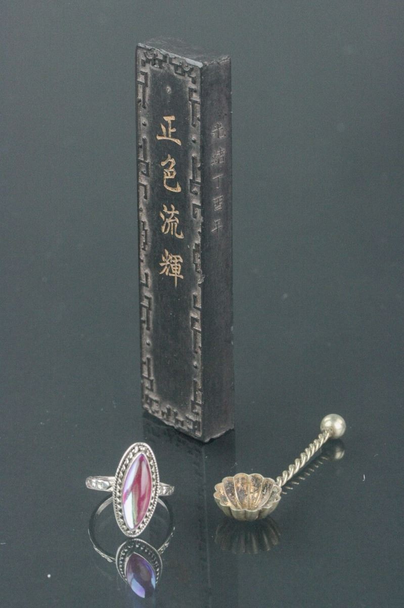 Three pieces of Chinese decorative items; comprised of one Guangxu marked ink stick, one gemstone ring and one flower-shaped spoon; W: 2 cm, L: 10 cm, Ring Size: 8, 60 grams total