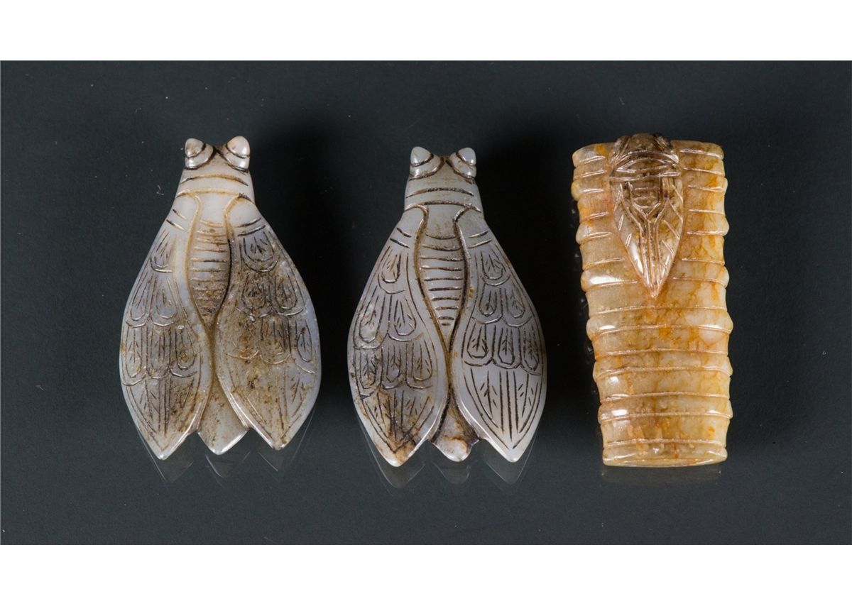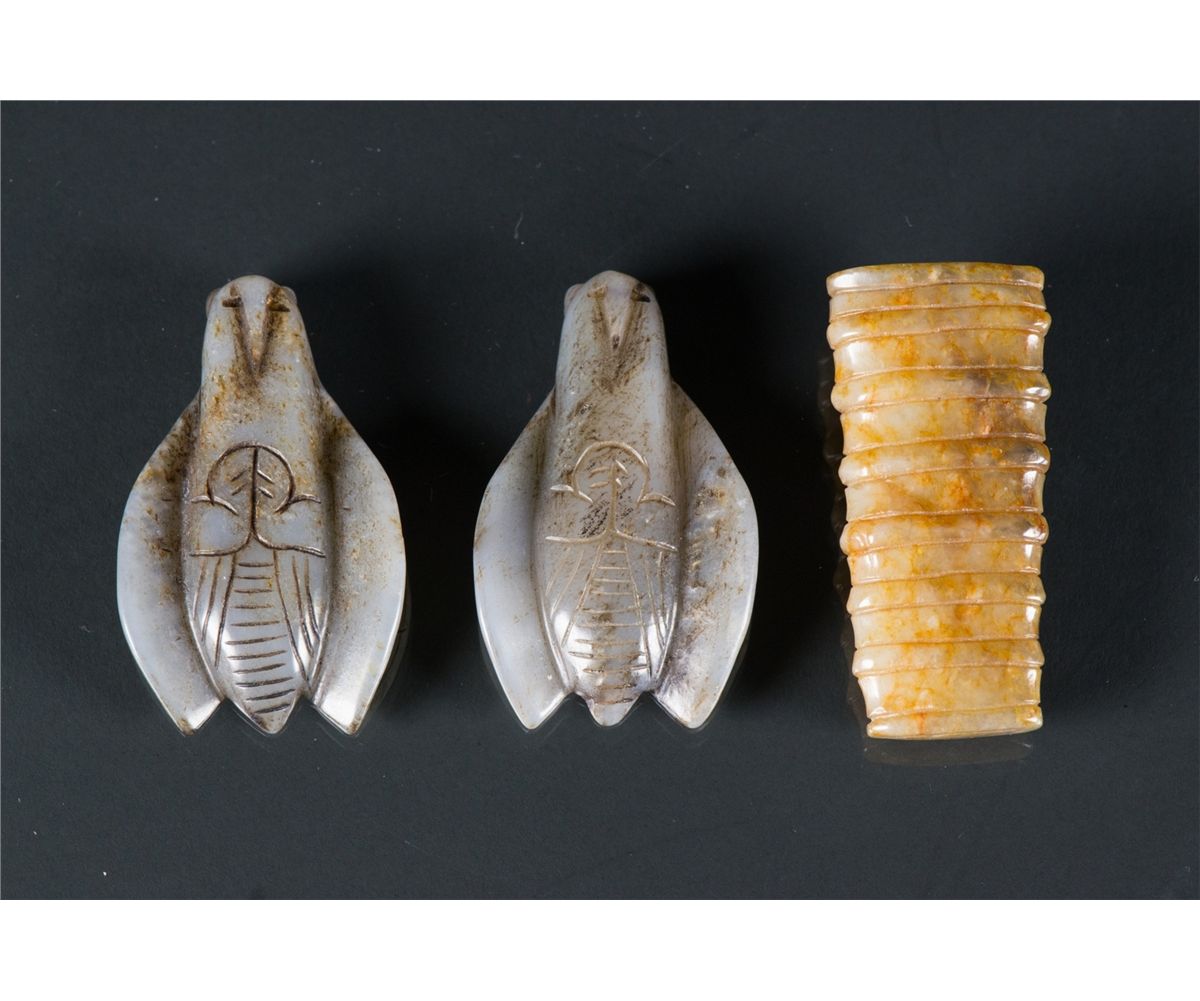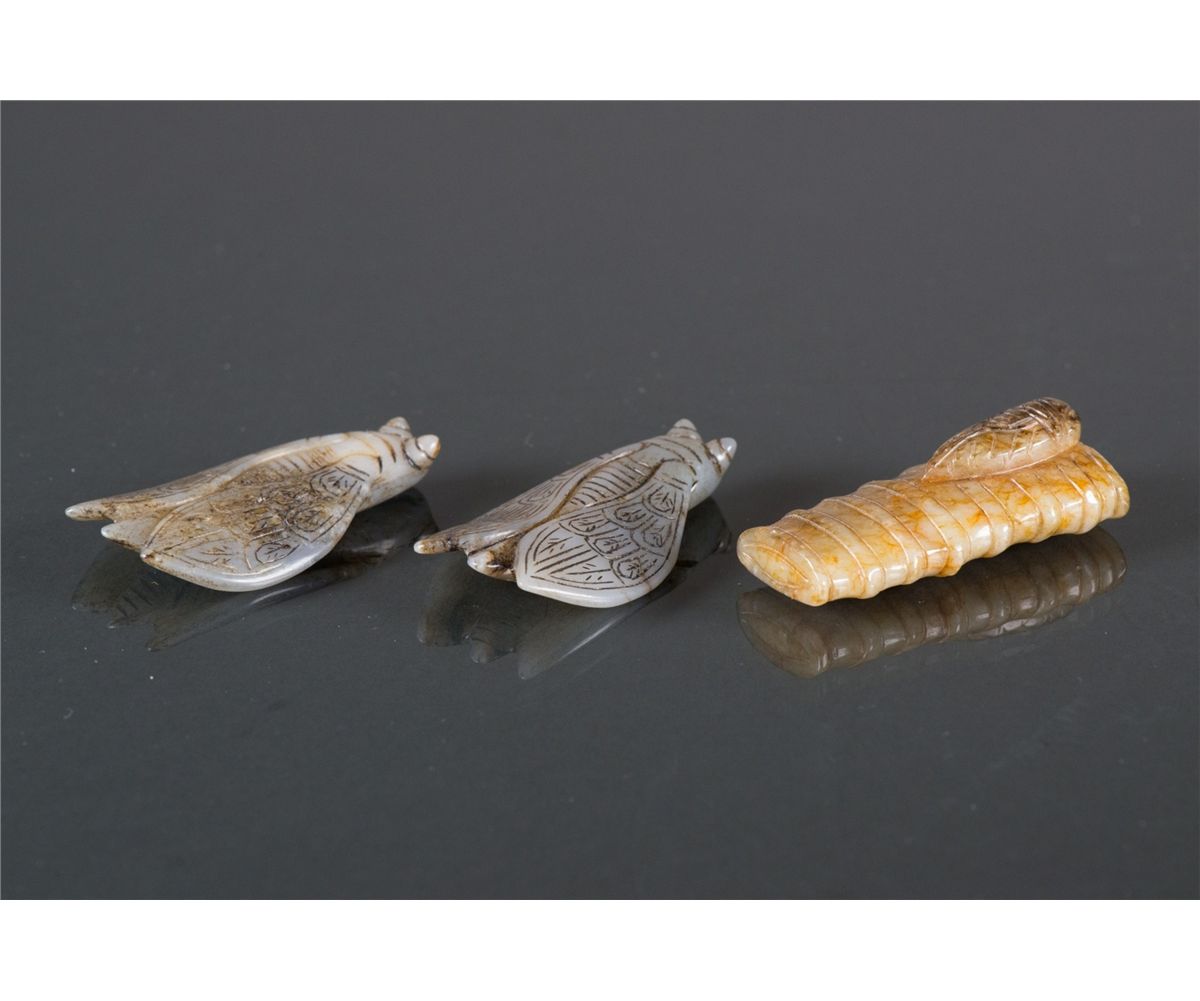Three pieces of Chinese jade carved cicada and bamboo hand pieces; of white and russet tone; H: 6 cm, W: 3.5 cm, 79 grams total