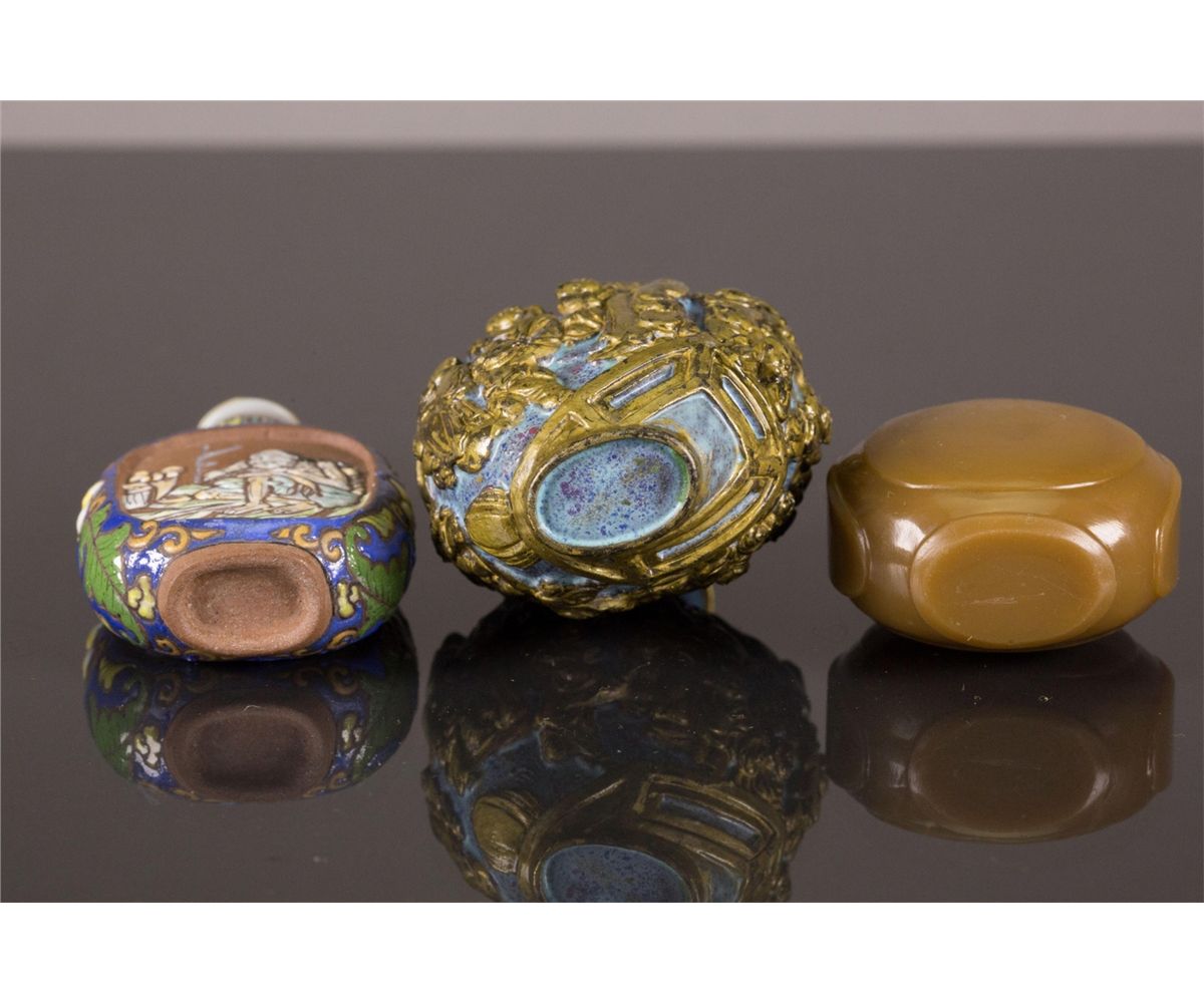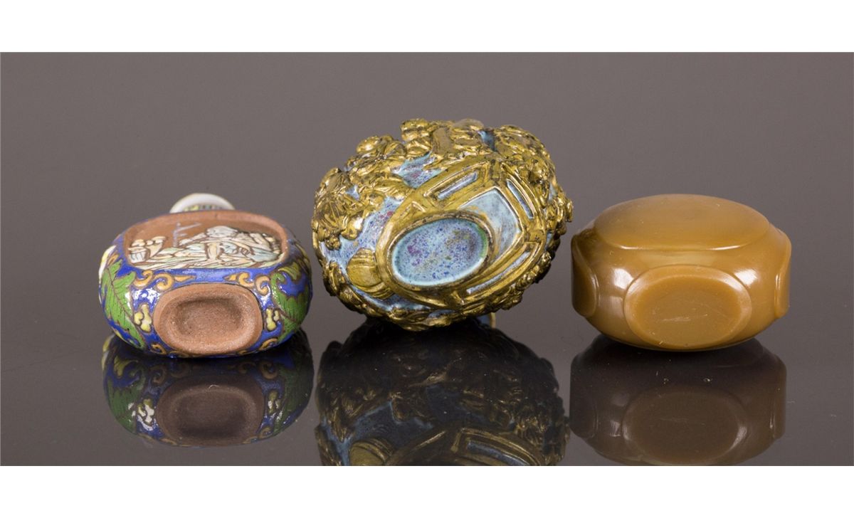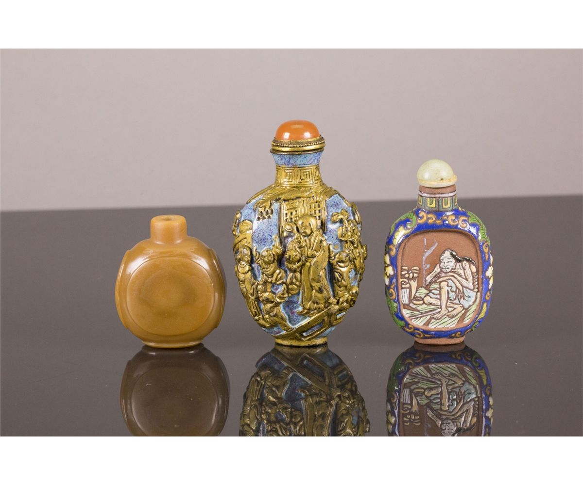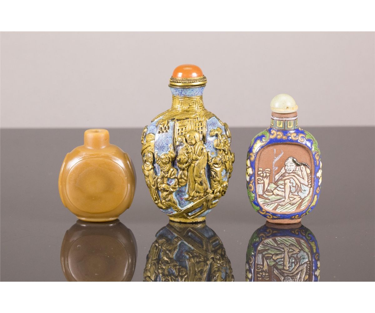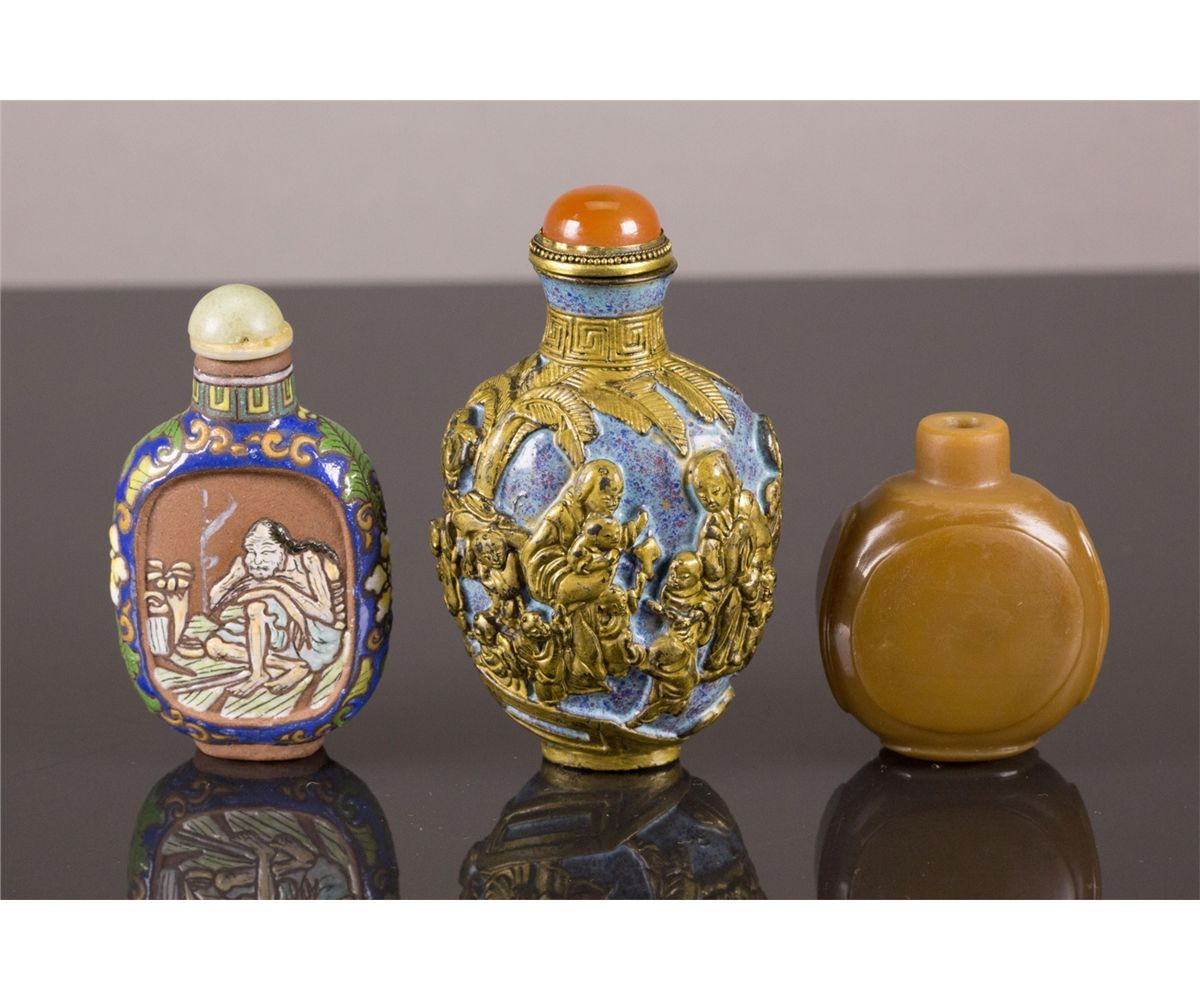 Three pieces of Chinese snuff bottles; featuring figures in low-relief; H: 9 cm, W: 4.5 cm, 160 grams total