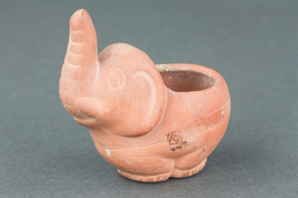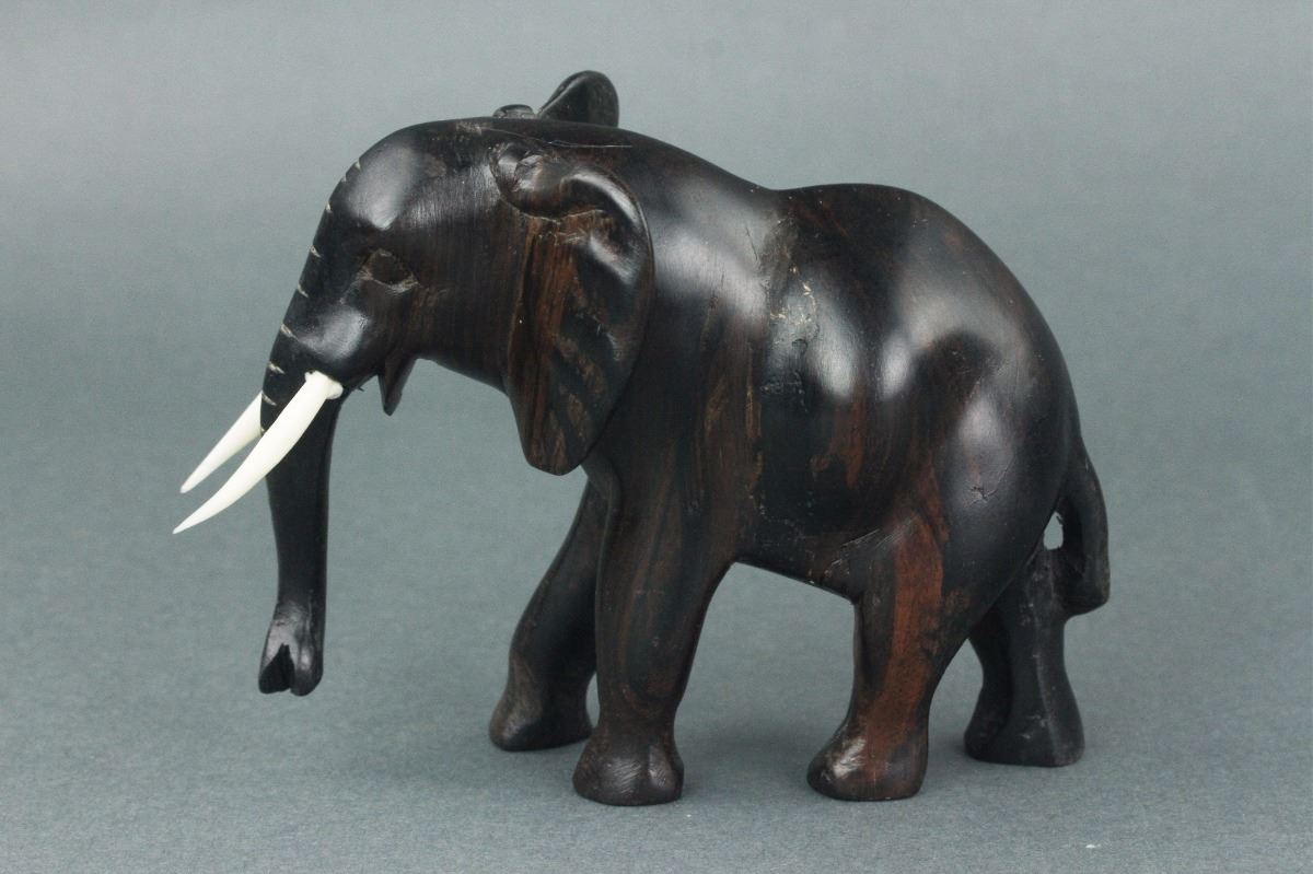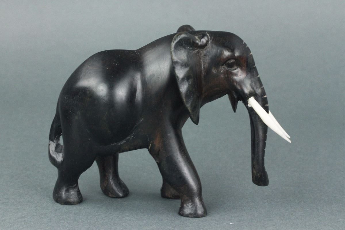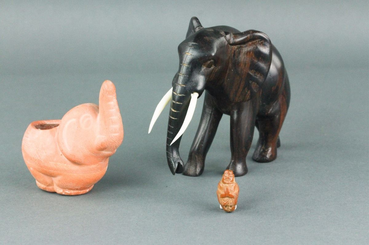 Three pieces of decorative items; comprised of a wood carved elephant with non-ivory tusks, a pottery elephant waterpot and a olive nut carved bead; H: 10 cm, W: 13 cm, 370 grams total