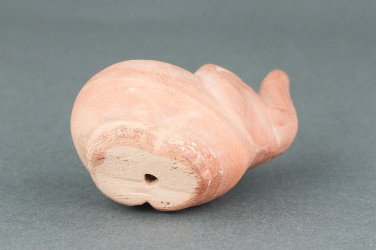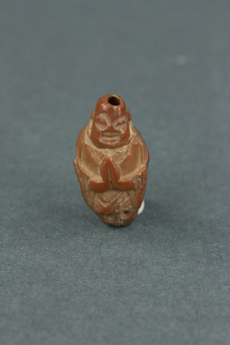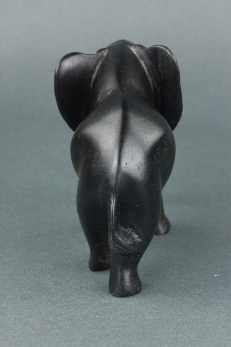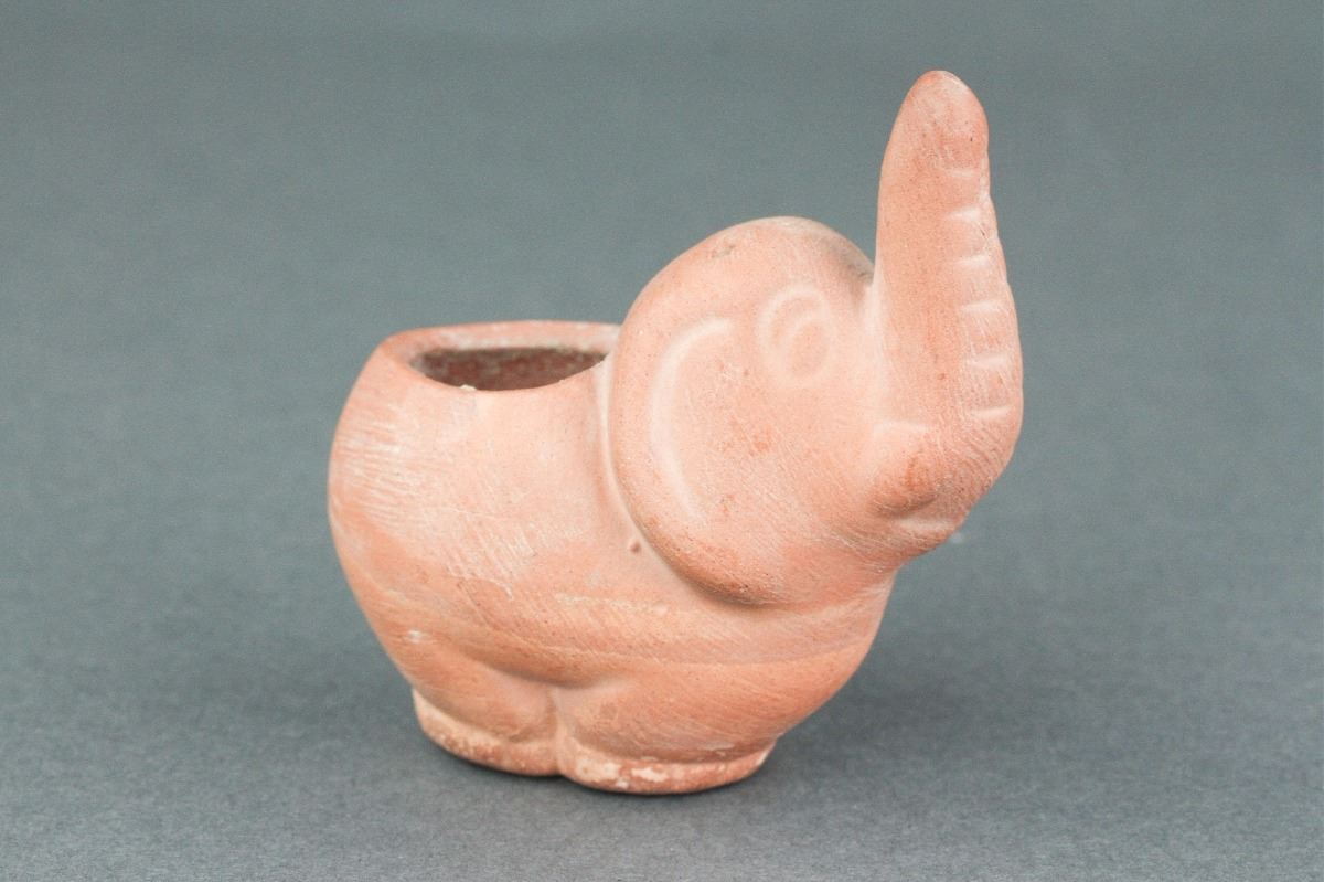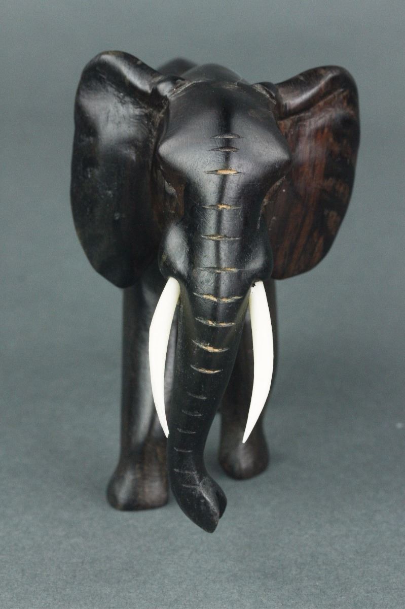 Three pieces of decorative items; comprised of a wood carved elephant with non-ivory tusks, a pottery elephant waterpot and a olive nut carved bead; H: 10 cm, W: 13 cm, 370 grams total