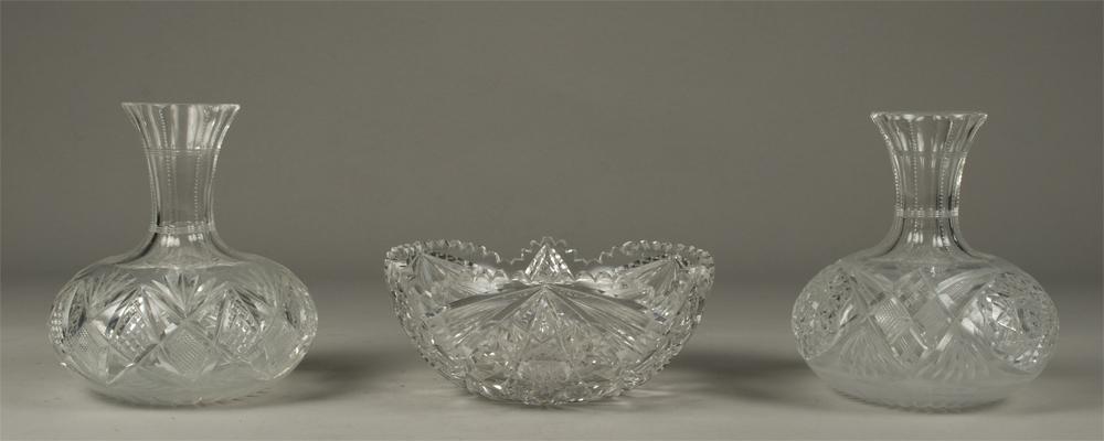 Includes two decanters, 7.25" H and bowl with waved rim, 3.5" H x 8.5" W. Several chips to rim of one decanter.