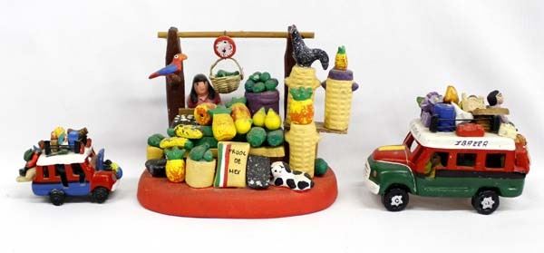 3 Pieces of Folk Art Pottery, includes: 1. Otualo Ecuador Pottery Tourist Bus, measures approx. 2'' x 3'' x 4'' 2. ''A miniature Mexican folk art fruit and vegetable market stall tended by a senora. It is all made of clay except for the hanging rod above the stall which is wood. There are numerous fruits and veggies for sale as well as baskets which are hanging on one side of the wood rod. There is also a small hanging scale used to weigh the goods.'', measures 3'' x 5.5'' x 6'' and is marked Hecho en Mexico 3. Antigua Caribbean Local Pottery Bus, measures 1'' x 2'' x 3''