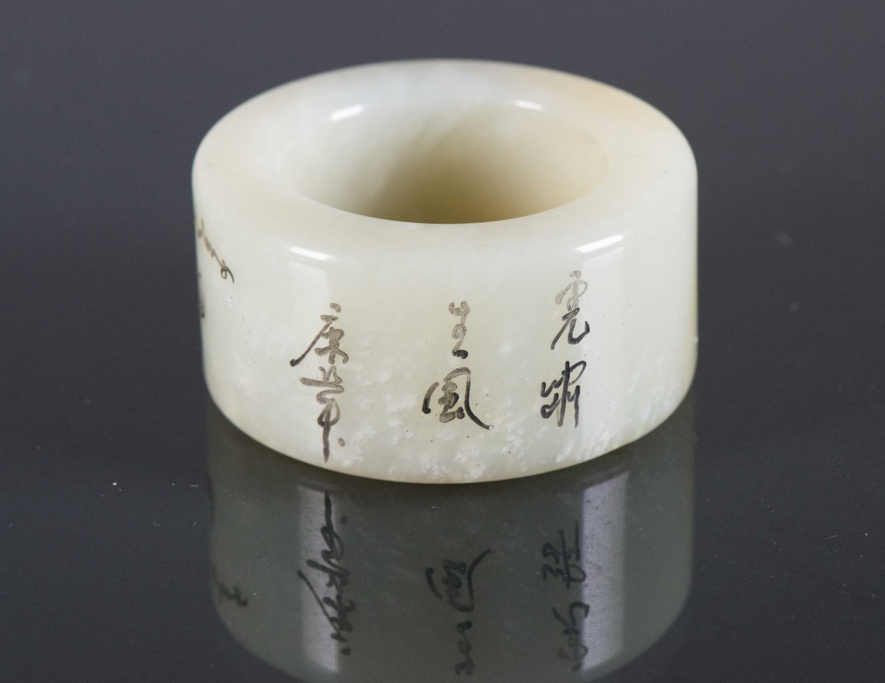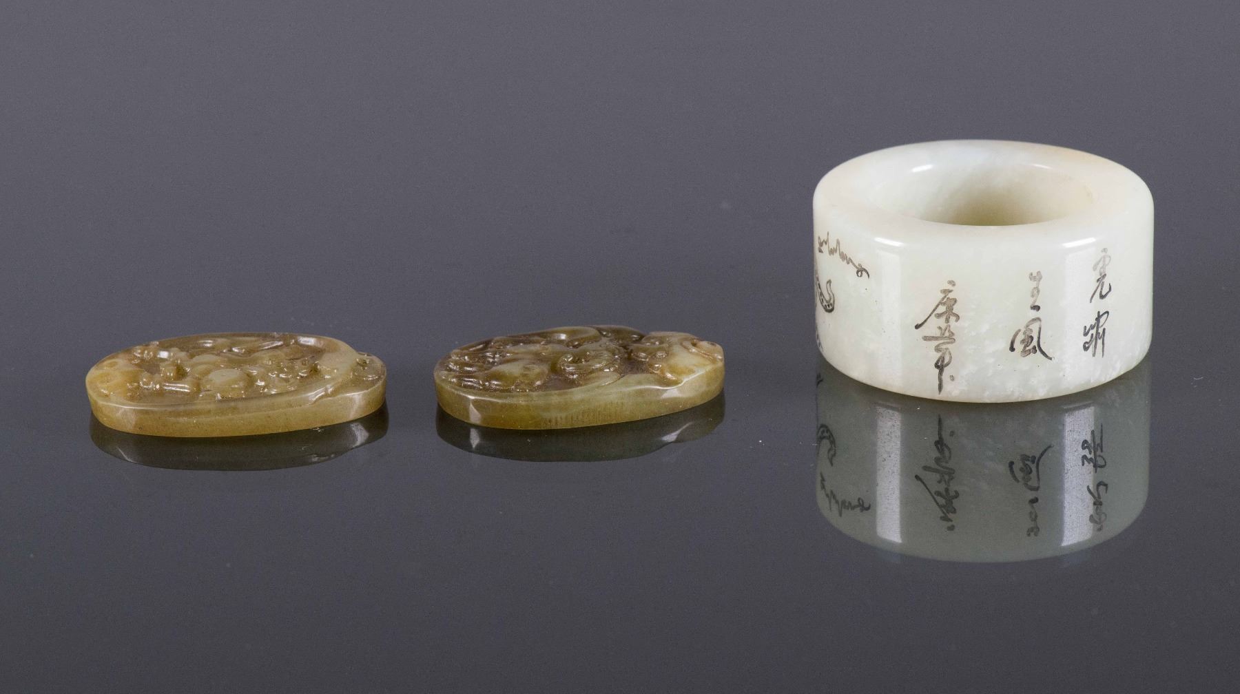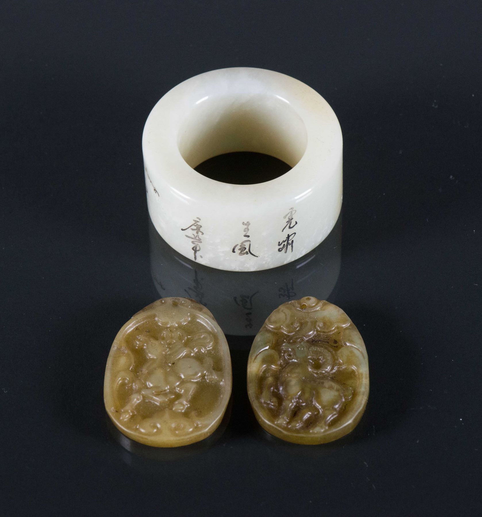 Three pieces of Chinese jade carved pendants; comprised of two olive green animal carved pendants and one white archer ring; H: 3 cm, D: 5.5 cm, 142 grams total