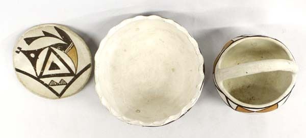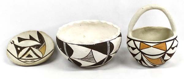3 Pieces of Native America Vintage Acoma Pottery, largest measures 2.5'' x 4.5'', pottery basket by Helen Patricio