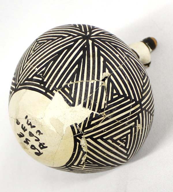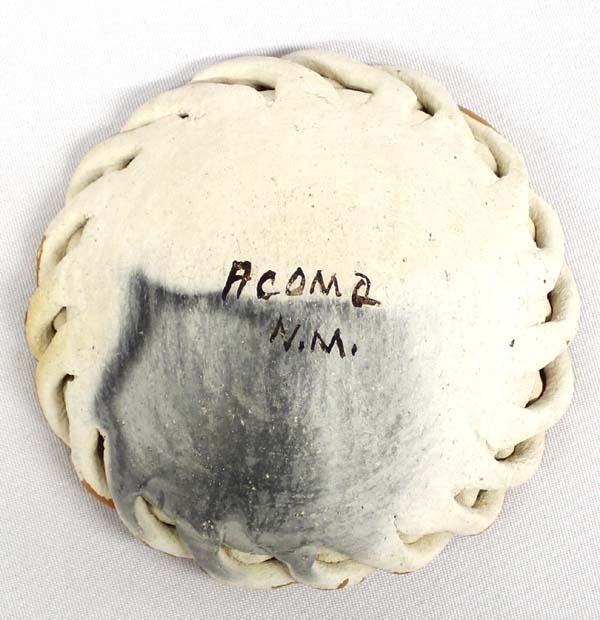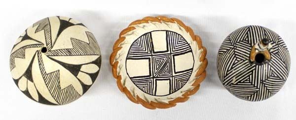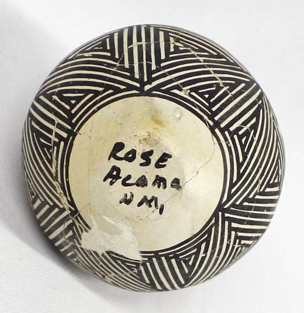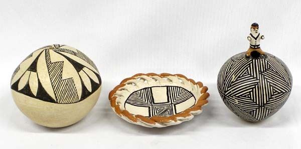 3 Pieces of Native American Acoma Pottery, largest measures 4.5'' x 4'' and includes 1. Early Native American Acoma Pottery Seed Jar by Rose Chino Garcia (1928-2000), measures 4.5'' x 3.5'' and is signed on the bottom, jar has been glued and is missing paint on the back 1''L x .5'' 2. Vintage Seed Jar by A. L. Chino, signed on the bottom 3. Vintage Shallow Bowl, measures 4.5'' x 1'', smeared ink stain on the bottom