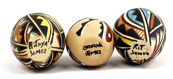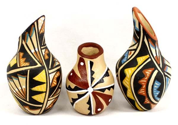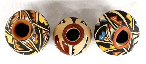 3 Pieces of Native American Jemez Miniature Pots, includes: 1. Polychrome Pulled Spout Vase by R. Toya   2. Pulled Spout Vase by Chinana   3. Pulled Spout Vase by R. Toya (largest measuring 3.5''L), they all have slant cut spouts
