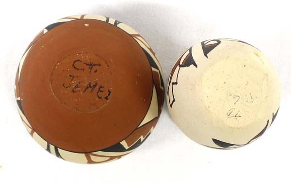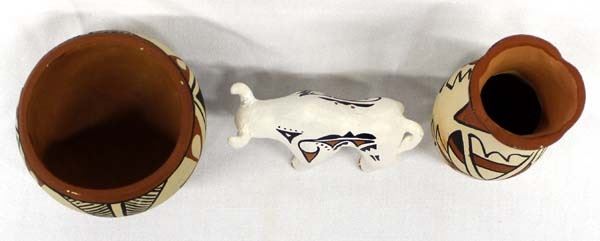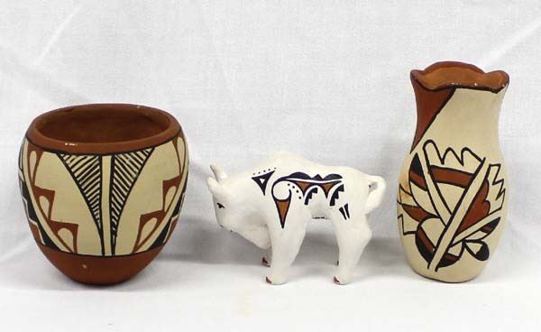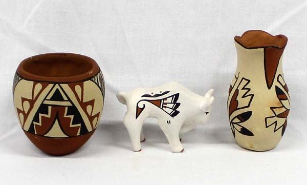 3 Pieces of Native American Jemez Pueblo Pottery, largest measures 4''H, includes polychrome vase (artist's initials on the bottom), jar (artist's initials on the bottom), and buffalo by F. Chinana (right horn has been glued)