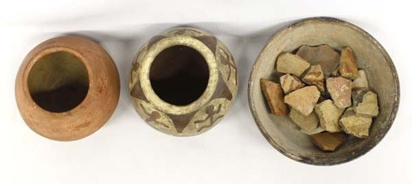 3 Pieces of Native American Pottery and Painted Pottery Sherds, includes 1. Pot with Running Figures on it, artist's intials on the bottom 2. Micaceous Clay Jar, unsigned 3. Brown Plainware Bowl, unsigned, largest measures 3.5'' x 4'', one of the sherds has a drill hole through it