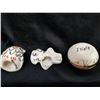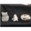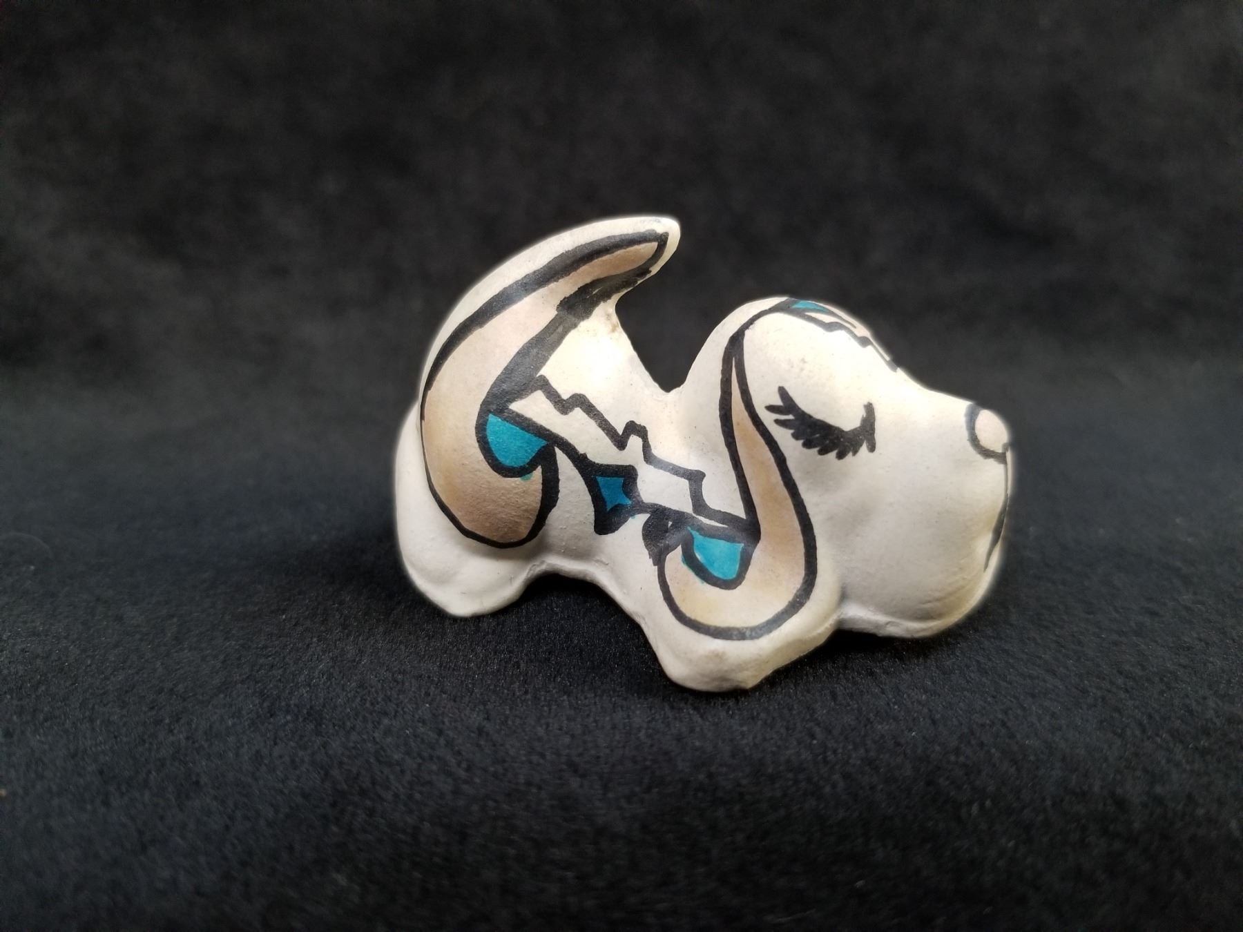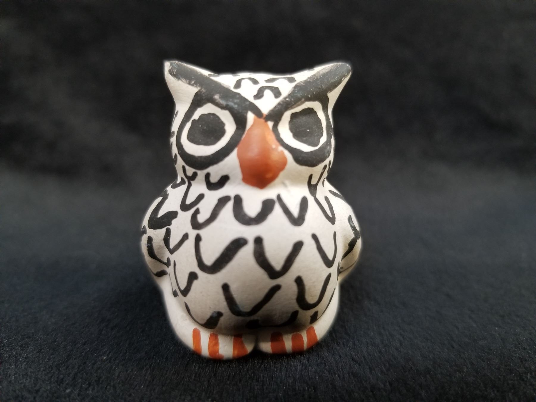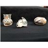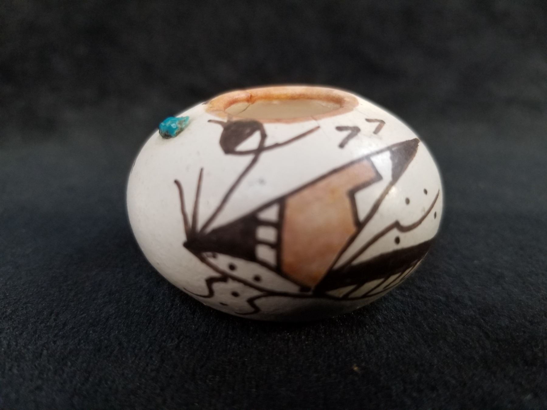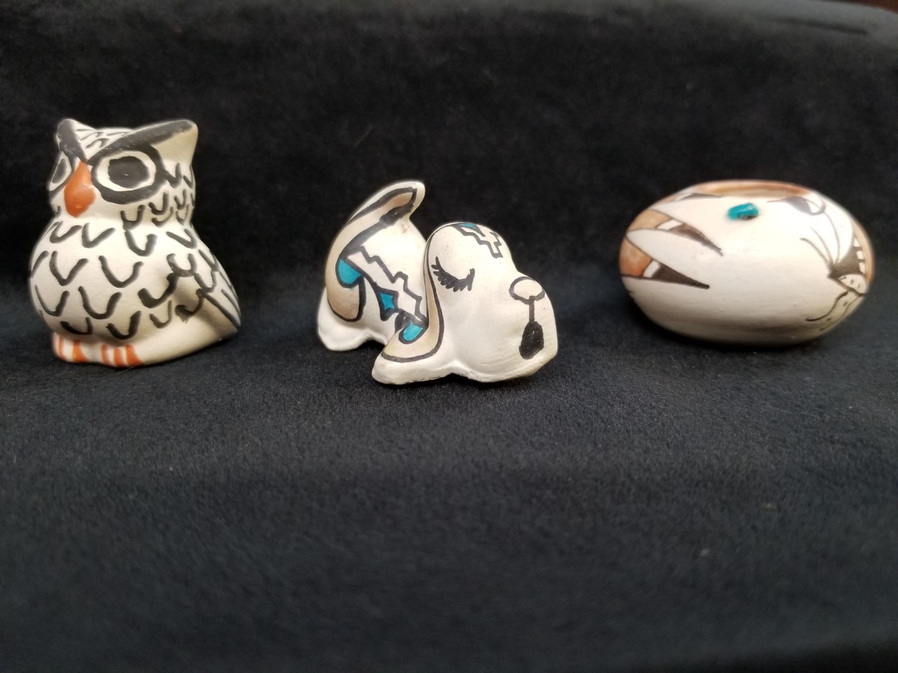 3 Pieces of Native American Pottery, includes 1. Ute Pottery Dog 2. Acoma Owl 3. Isleta Pottery Bowl, embellished with small piece of turquoise, largest measuring 1.75''D x 7/8''H