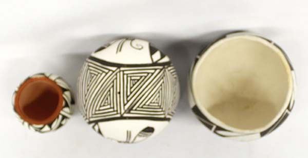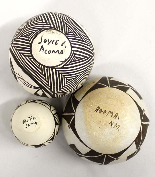 3 Pieces of Native American Pottery, largest measures 3'' x 4'', includes Acoma Seed Jar by Joyce Leno Barreras, Small Jemez Pottery Jar by M.J. Toya, and Vintage Acoma Pottery Bowl--unsigned