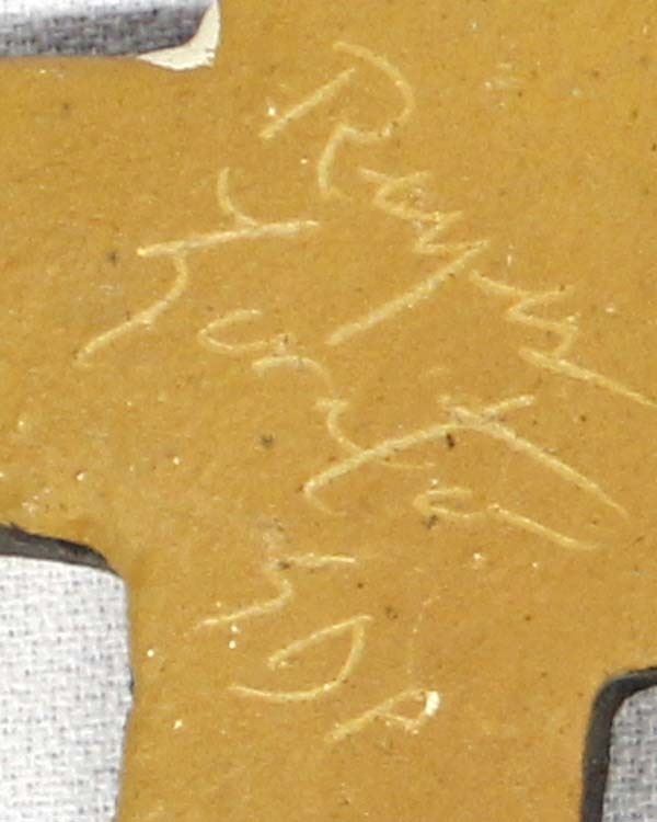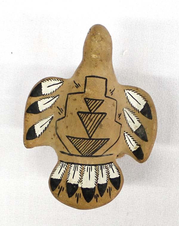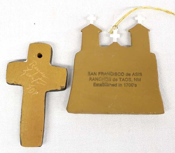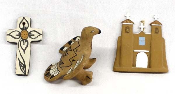 3 Pieces of Native American Pottery Plus, includes: 1. Santo Domingo Pueblo Pottery Cross Pendant by Reyes Lovato, measures 2'' x 3.5'' and is signed on the back 2. Jemez Pottery Eagle, measures 4.5'' x 3'' x 2'', minor chip on back of right foot 3. San Francisco de Asis Ranchos de Taos Church Pottery Ornament, measures 3.25'' x 3.5''