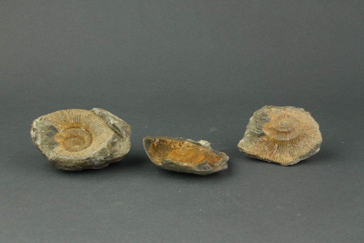 Three pieces of old ammonite fossils; of natural form; H: 4 cm, W: 7.5 cm, 400 grams total